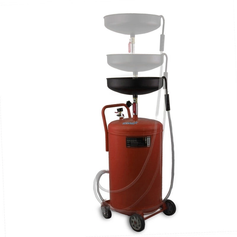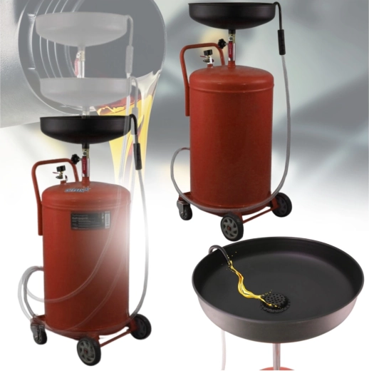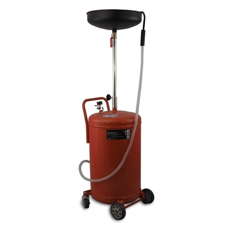 Ez a piros, 80 literes olajleeresztő megkönnyíti a használt motorolaj gyűjtését és ürítését közvetlenül a jármű alatt. A magasságban állítható tölcsér (100–160 cm) 38,5 cm-es széles átmérővel megbízhatóan felfogja a folyadékot kilöttyenés nélkül, míg a sűrített levegős ürítés gyors és tiszta hulladékátvitelt biztosít.