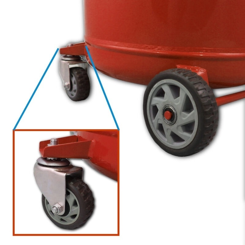 Két fix kerék és két forgó görgő biztosítja a könnyű manőverezést még teli tartállyal is. A robusztus acélszerkezet ellenáll az igénybevételnek.