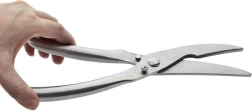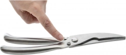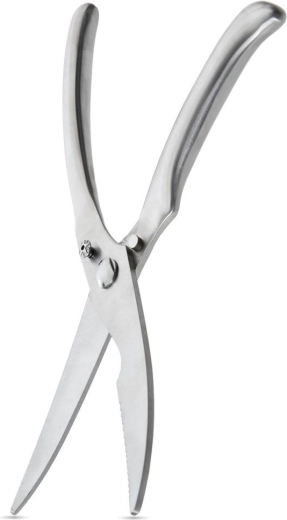 Masszív rozsdamentes baromfiolló 25 cm hosszban, éles, fogazott pengékkel, robosztus, teljesen fém kialakítással és biztonsági reteszeléssel a csirke, kacsa vagy pulyka egyszerű feldarabolásához. Mosogatógépben mosható, ideális a mindennapi használathoz.