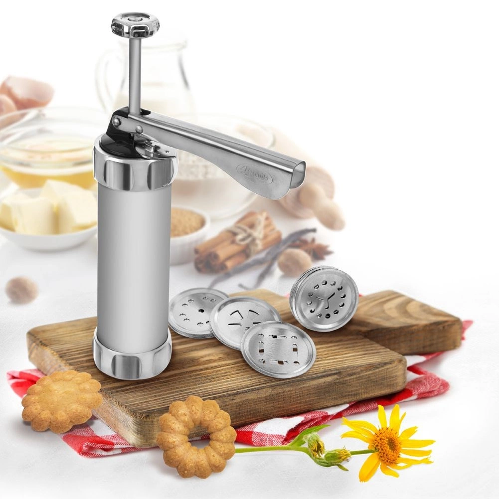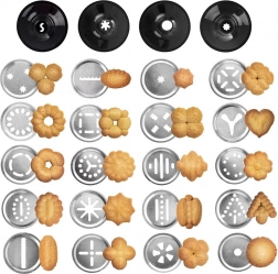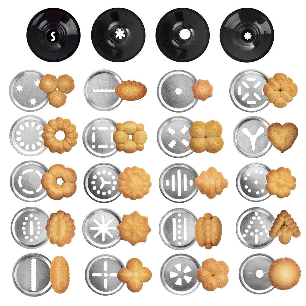Egyetlen készlettel tucatnyi különböző stílusú kekszet készíthet – csillagokat, virágokat, csíkokat vagy szíveket. Csak cserélje ki a korongot és préseljen.