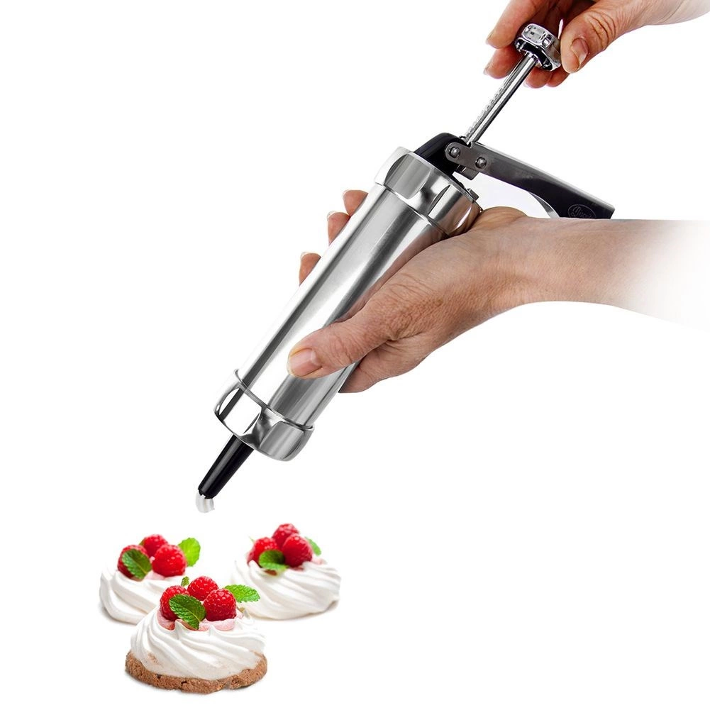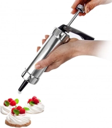 A kekszek mellett a 4 krém- és tejszínhabcsőnek köszönhetően tortákat és desszerteket is díszíthet. Egyetlen karlenyomás egyenletes adagolást biztosít.