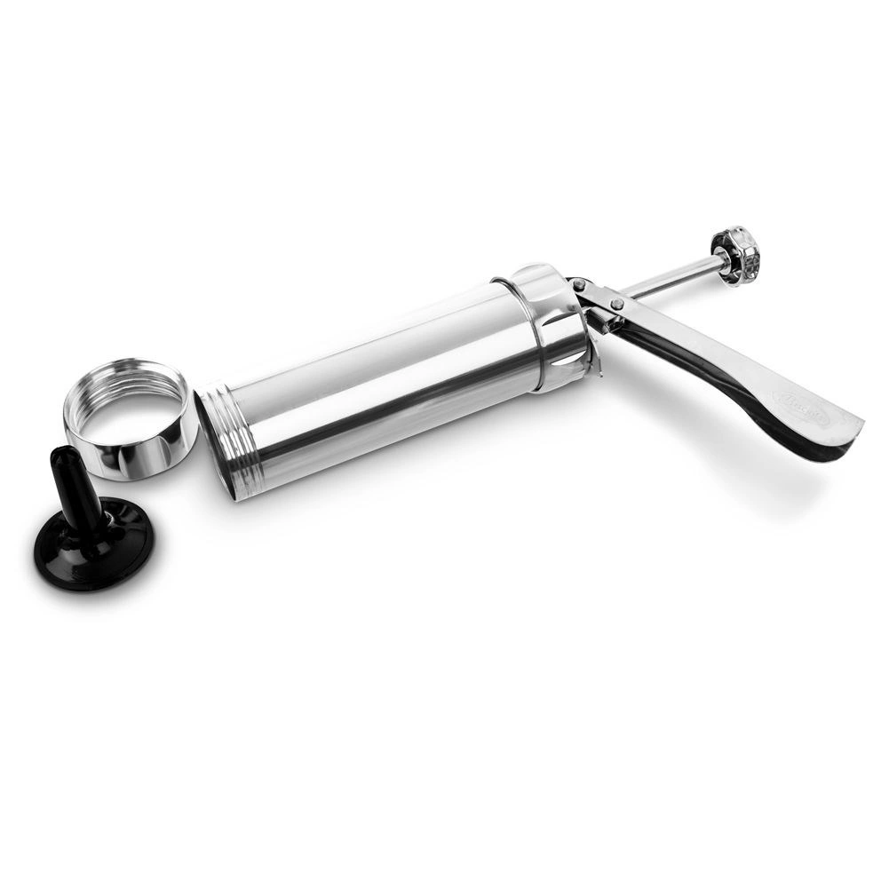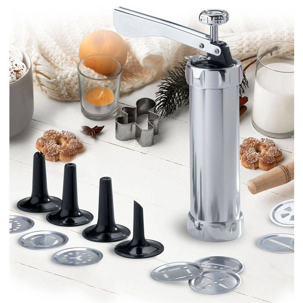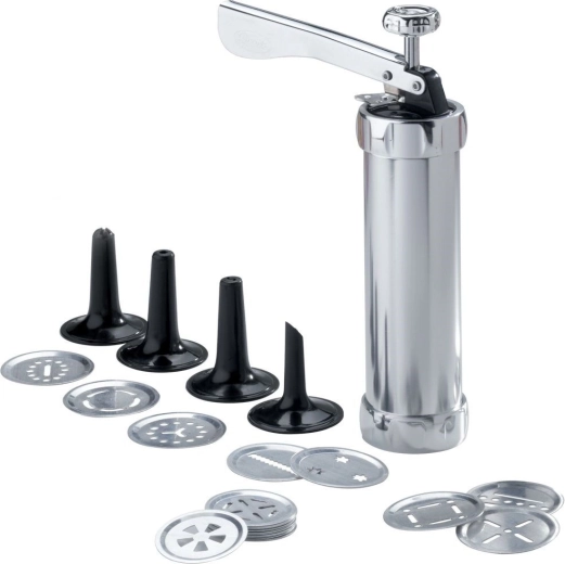 Ez a 25 darabos készlet egyesíti a kekszprést és a díszítőpisztolyt, így könnyedén megoldja a tészta formázását, a krémdíszítést és a fánkok töltését is. A fém test hosszú élettartamával és munkaközbeni stabilitásával tűnik ki, míg az ergonomikus kar és a dugattyú pontos, megismételhető adagolást tesz lehetővé.