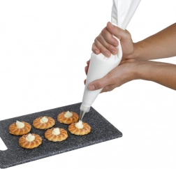 A cukrász habzsák megkönnyíti krémek, mázak és töltelékek töltését és díszítését. A belső gumírozott réteg megakadályozza az átszivárgást, és lehetővé teszi a munkát sűrű és folyékonyabb masszákkal egyaránt. A rugalmas anyagnak köszönhetően a díszítés pontos és kényelmes, legyen szó tortákról, cupcake-ekről, kekszekről vagy sós falatkákról.
