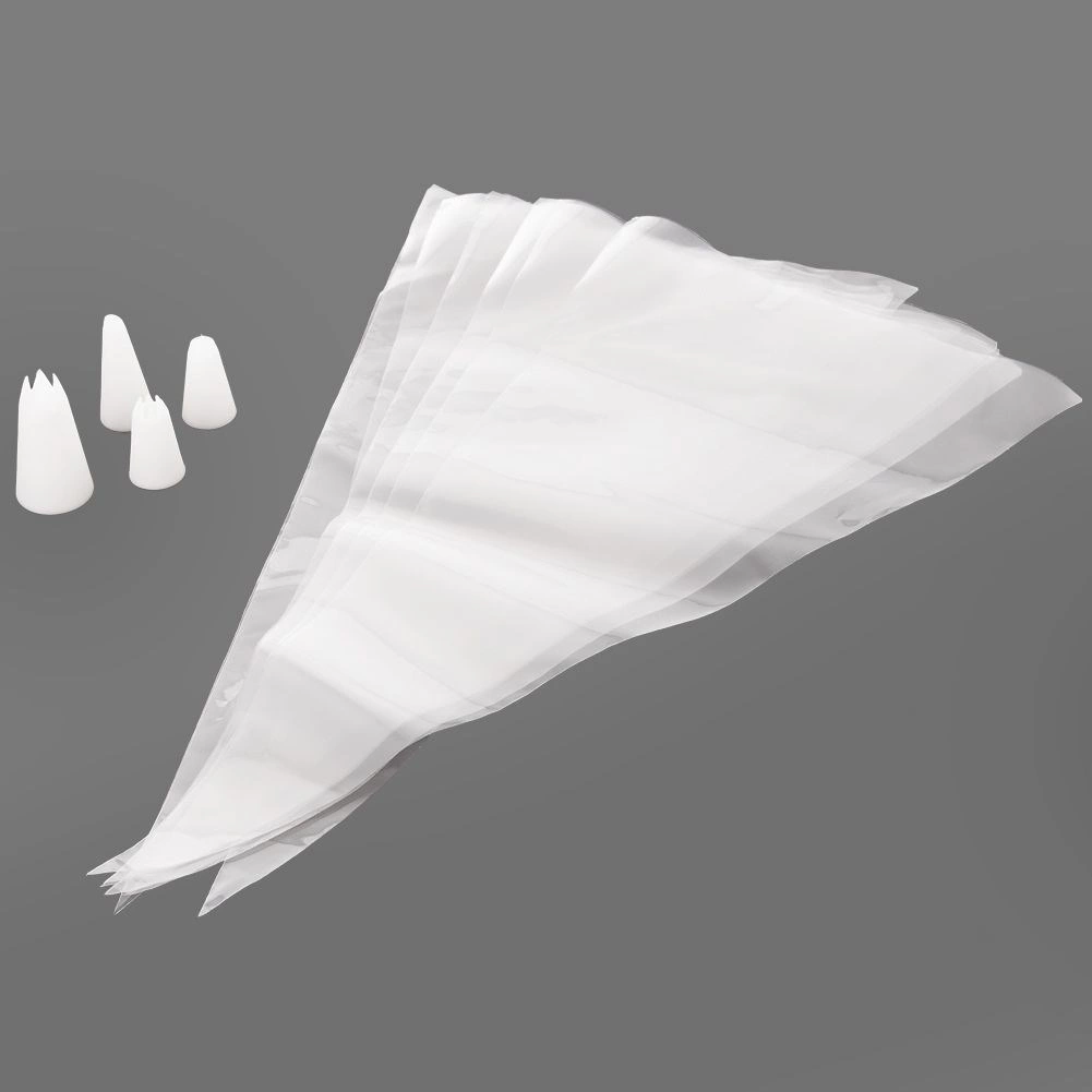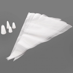 Ezzel a komplett készlettel elegáns díszítést készíthet krémmel, tejszínhabbal vagy mázzal, valamint precíz töltést is elérhet. A 35 cm-es zsákok kényelmes fogást adnak, és a cserélhető fejekkel különböző díszítőmintákat alkothat a finom csillagoktól a határozott vonalakig. A tartós műanyag elemek többszöri használatra alkalmasak és könnyen tisztíthatók.