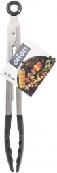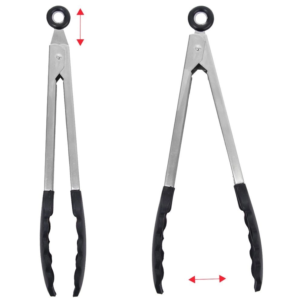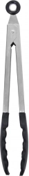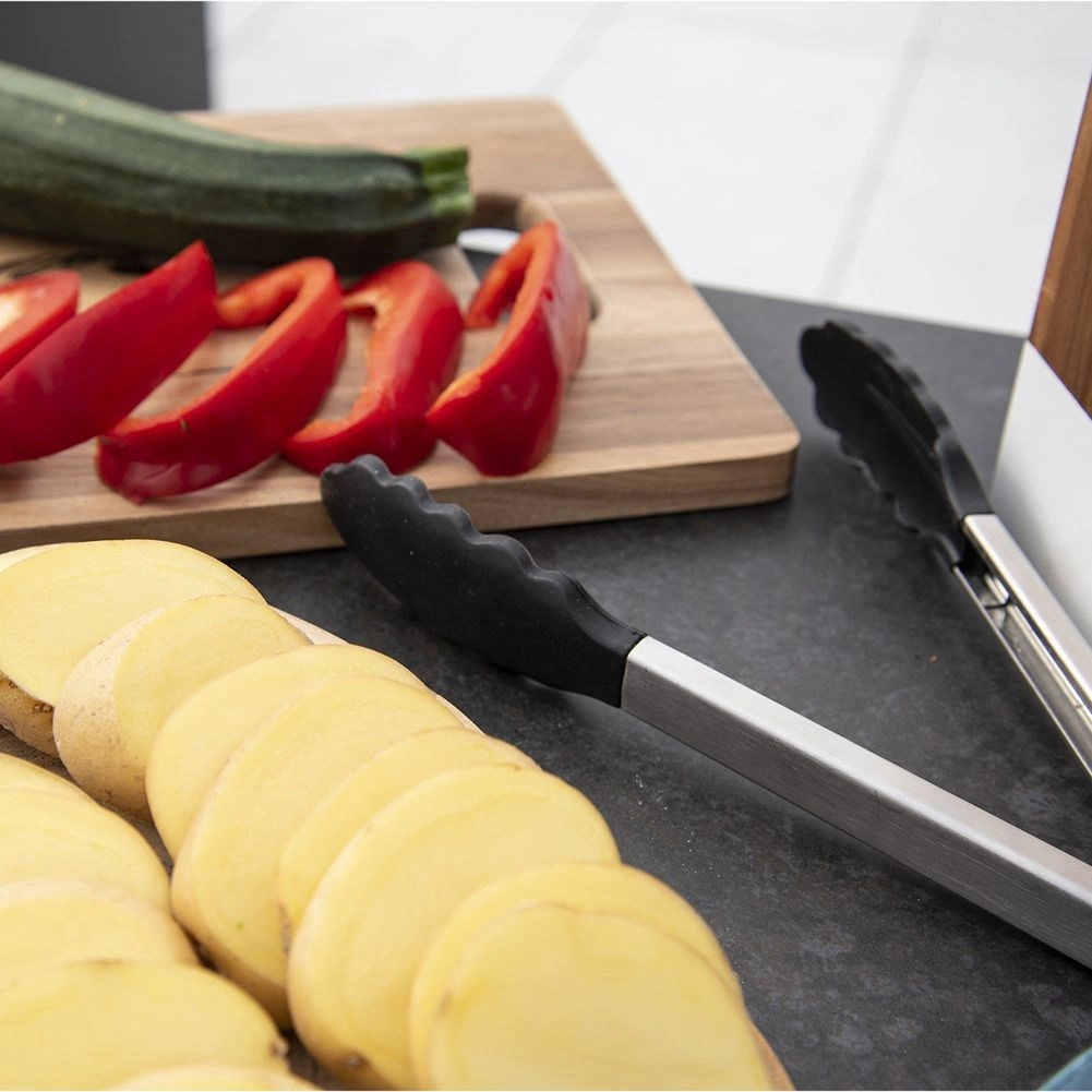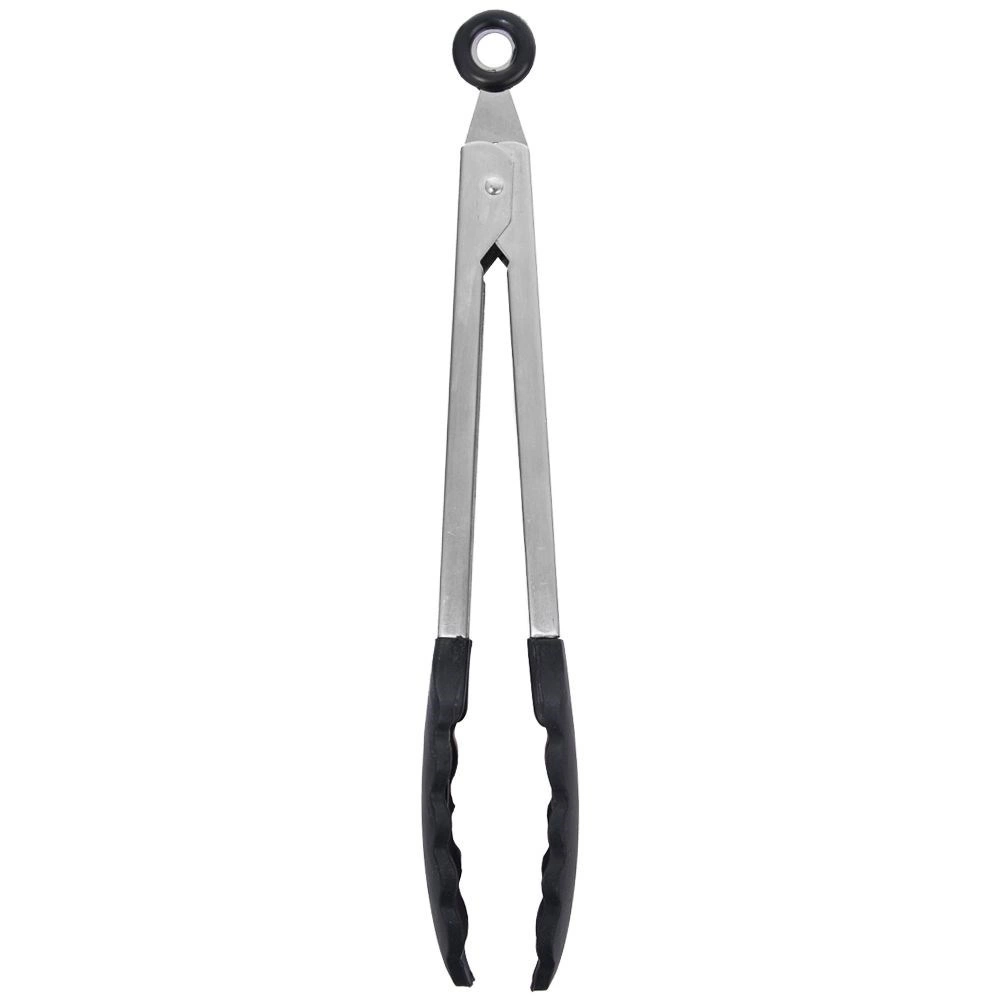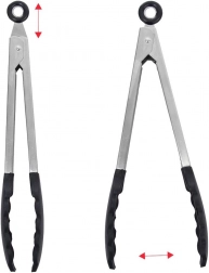 Praktikus, 27 cm hosszú rozsdamentes acél konyhai fogó fekete szilikon végekkel a kíméletes és biztos fogásért. Ideális főzéshez és grillezéshez, hőálló szilikonnal 220 °C-ig, tapadásmentes felületekhez biztonságos, valamint záróreteszeléssel a helytakarékosságért.