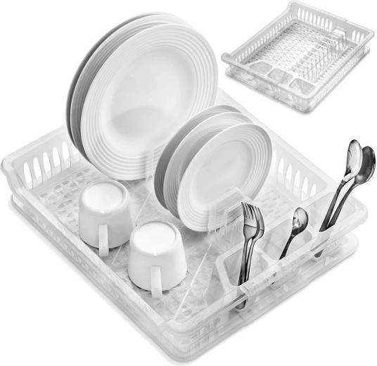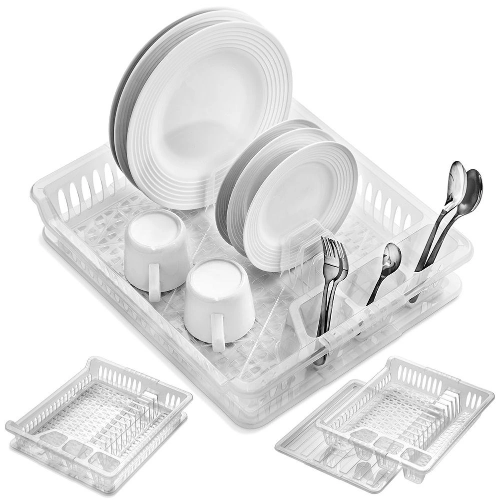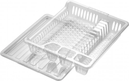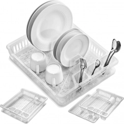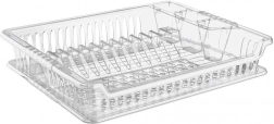 Kompakt edényszárító kiváló minőségű, félig áttetsző műanyagból, kivehető csepegtetőtálcával. Helyet kínál 12 tányérnak, külön részt a csészéknek és tálkáknak, valamint 3 evőeszköztartó rekeszt. A konyhapultot tisztán és szárazon tartja, könnyen tisztítható, és illik a modern és a klasszikus konyhákhoz is.