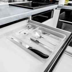 Rendezze áttekinthetően és erőfeszítés nélkül a fiókot. Az átlátszó evőeszköztálca hatékonyan osztja fel a teret, így minden kéznél van. A minőségi anyag hosszú élettartamot és tiszta megjelenést biztosít a mindennapi használat során.