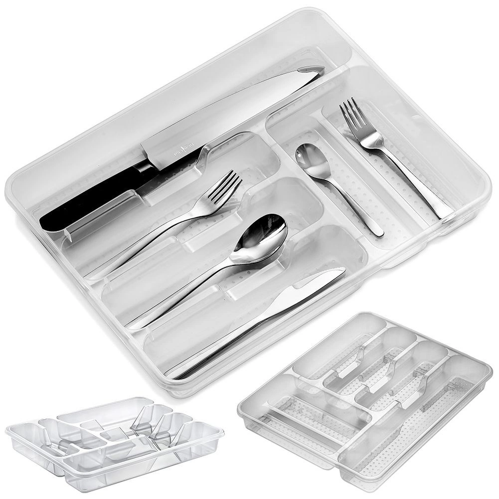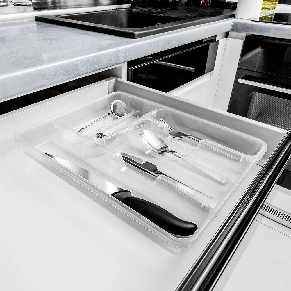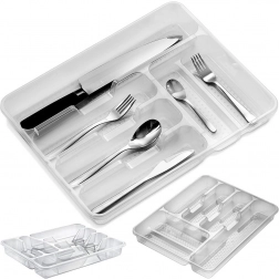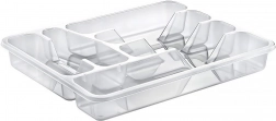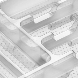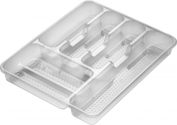 Praktikus, 38,5 × 31 × 5 cm méretű konyhai fiókszervező, amely rendezetten a helyén tartja az evőeszközöket és a kisebb eszközöket. Az átlátszó kivitelnek köszönhetően mindig átlátható a tartalom, a minőségi műanyagból készült masszív szerkezet tartós és könnyen tisztán tartható. A tálca több rekeszt kínál a különféle evőeszközök és konyhai kellékek számára, tágas, praktikus, és illik minden modern konyhába.