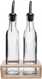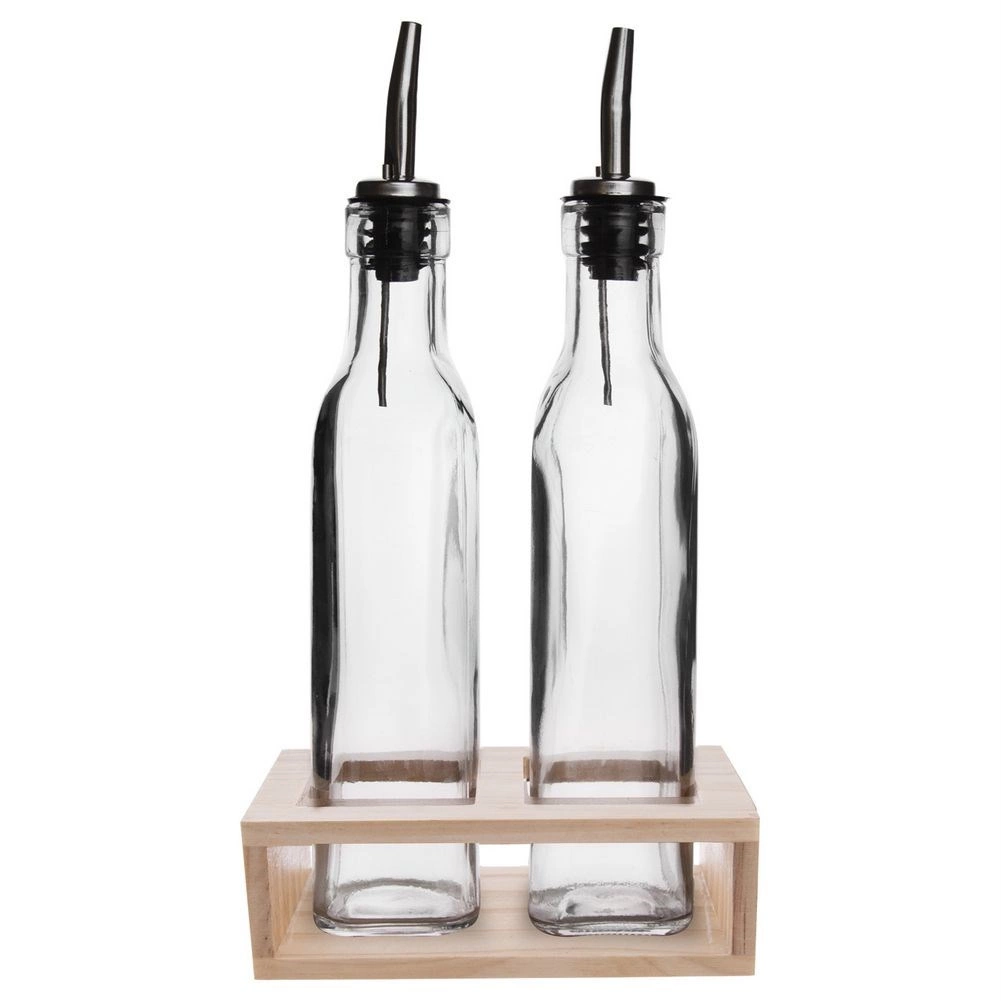 Ez a praktikus és dekoratív szett két átlátszó üvegpalackot tartalmaz levehető fém adagolókkal és stabil fa állvánnyal. Ideális extra szűz olívaolajhoz, balzsamecethez vagy borecethez és más ízesítőkhöz. Az adagolók lassítják az átfolyást a finom ízesítéshez salátákon, tésztákon és pizzán – rendetlenség nélkül.