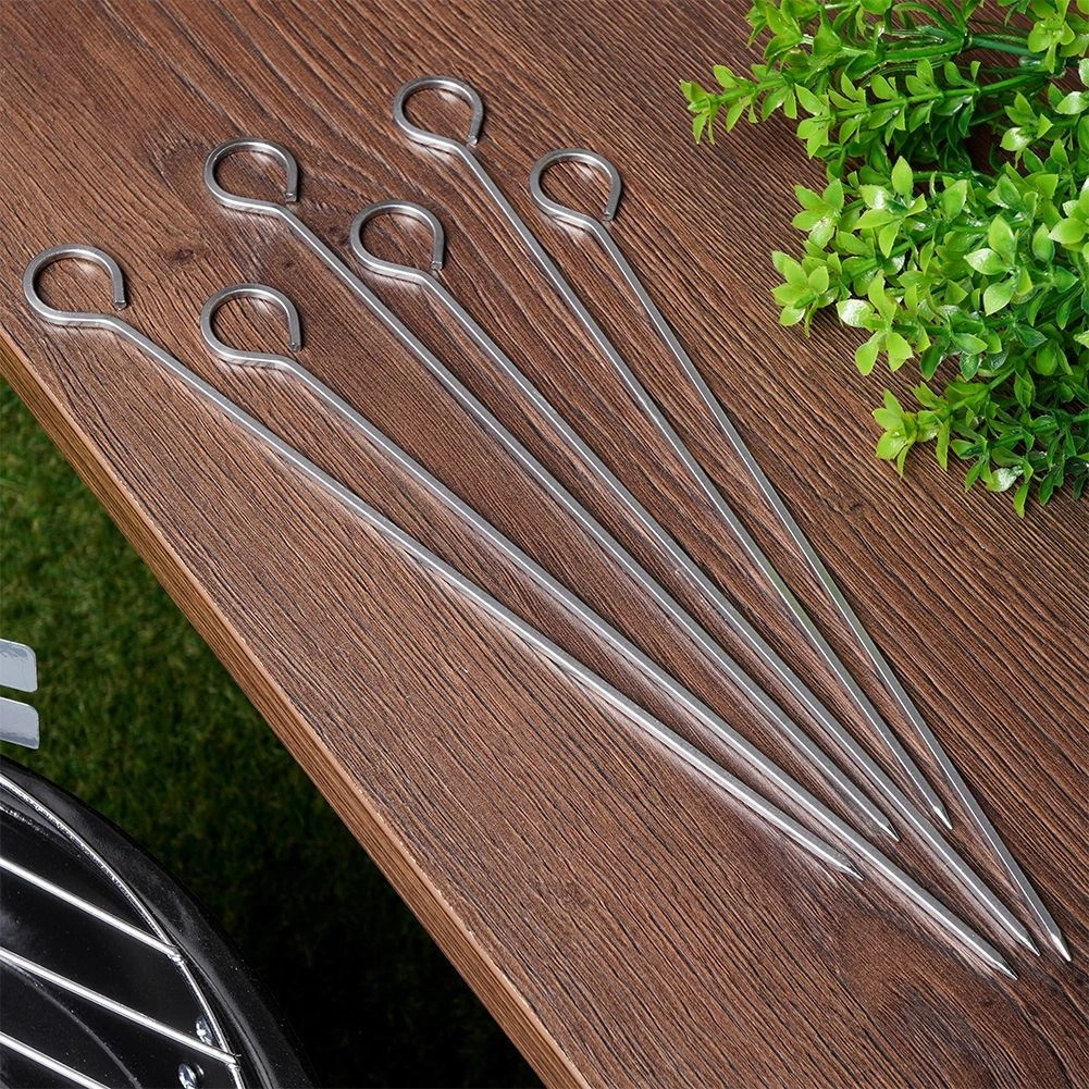 Élvezze a tiszta és egyenletes grillezést a 23,5 cm hosszú lapos acél nyársakkal. Ideális húsokhoz, zöldségekhez és saslikhoz, jól tartják a formát, és a huroknak köszönhetően könnyen megfordíthatók a parázs felett és tálaláskor. Sütőben sütésre is alkalmasak.