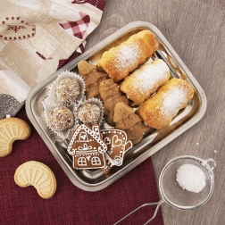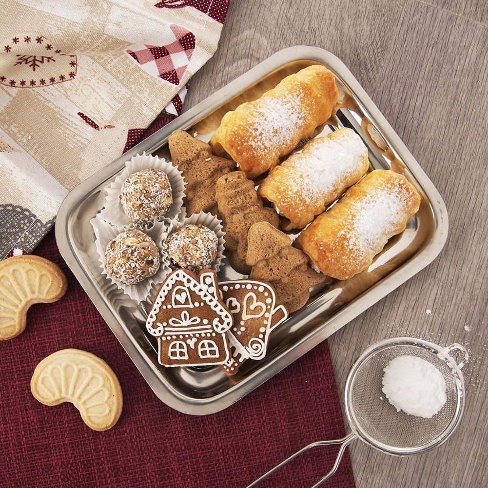 Stílusos rozsdamentes acél szervírozó tálca időtálló kivitelben, amely kiemeli az ételek prezentációját. Korrózióálló, nem deformálódik, és a polírozott felületnek köszönhetően professzionális megjelenést kölcsönöz az asztalnak. Alkalmas canapék, gyümölcsök, desszertek, falatkák és sós snackek tálalására.