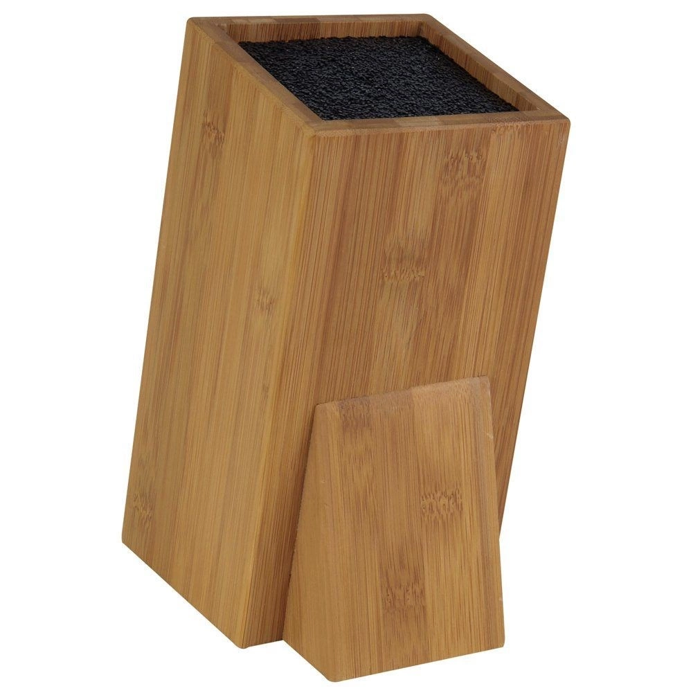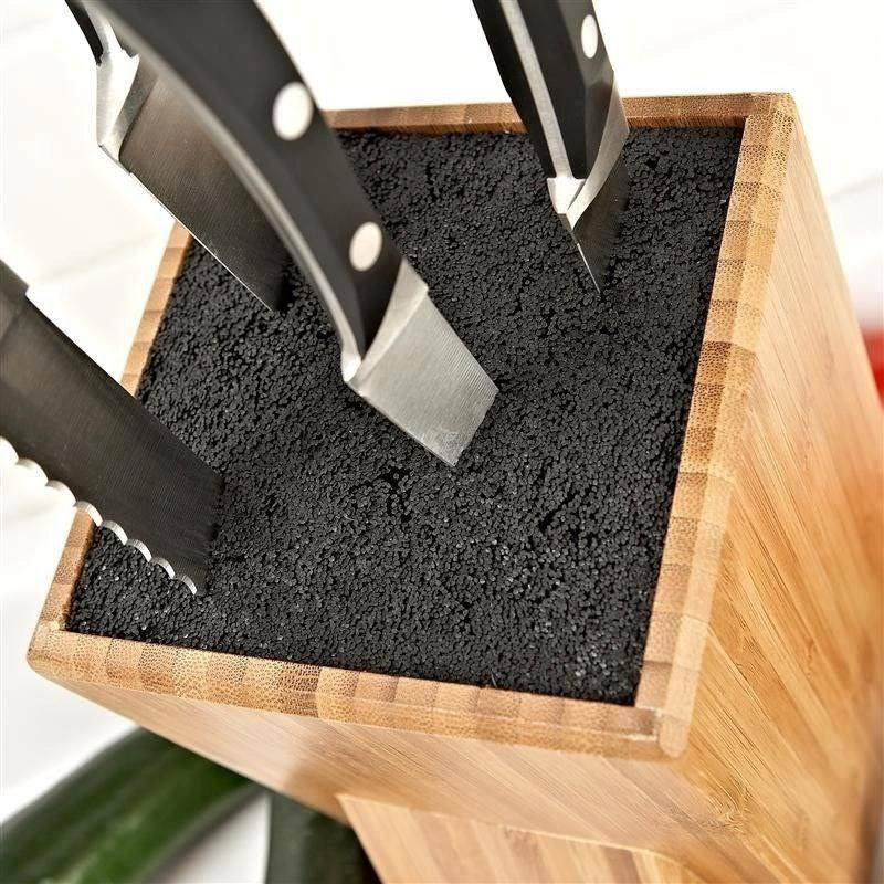 Elegáns bambusz késállvány 17 × 11,5 × 24,5 cm méretben, amely univerzális és biztonságos tárolást kínál bármilyen típusú konyhakéshez – acél, kerámia és kombinált pengékhez is. A kivehető műanyag szálbetétnek köszönhetően különböző pengeformákhoz alkalmazkodik anélkül, hogy koptatná az élüket, csúszásgátló talpakkal rendelkezik a stabilitásért, és modern dizájnja remekül illik bármely konyhába.