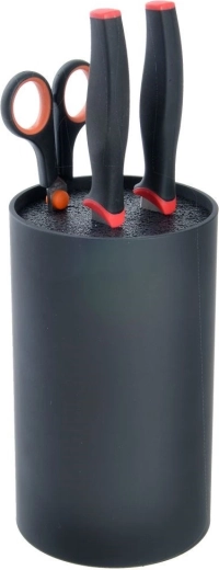 Praktikus és designos késblokk, amely biztonságban és kéznél tartja pengéit. A sűrű sörtés betétnek köszönhetően a kések, ollók és egyéb eszközök tetszőleges pozícióban helyezhetők be – vezetőhornyok nélkül, az él sérülése nélkül. Kompakt méretei helyet takarítanak meg a konyhapulton.