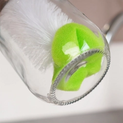A puha, zöld szivacsos csúcs finoman tisztítja a peremet és az aljat, megkarcolás nélkül, akár üvegről, akár műanyagról van szó.