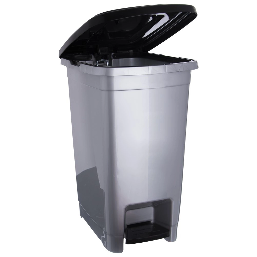 A 25 l űrtartalmú keskeny pedálos szemetes helytakarékos, és biztosítja a higiénikus, érintésmentes fedélnyitást. Tartós műanyag kivitel szürke színben fekete fedéllel és pedállal, belső kerettel a zsák rögzítéséhez, valamint megbízható zárással a szagszivárgás ellen – ideális konyhába, irodába és fürdőszobába.