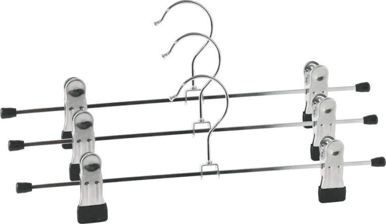 Praktikus, három darabos fém vállfa szett csipeszekkel a nadrágok és egyéb ruhadarabok áttekinthető tárolásához. A vállfák minőségi fémből készültek, állítható csipesztávolsággal rendelkeznek, helyet takarítanak meg a szekrényben, és segítenek megakadályozni a ruhák gyűrődését. Ideális farmerhez, elegáns nadrághoz, szoknyákhoz és gyermekruházathoz.