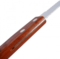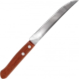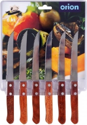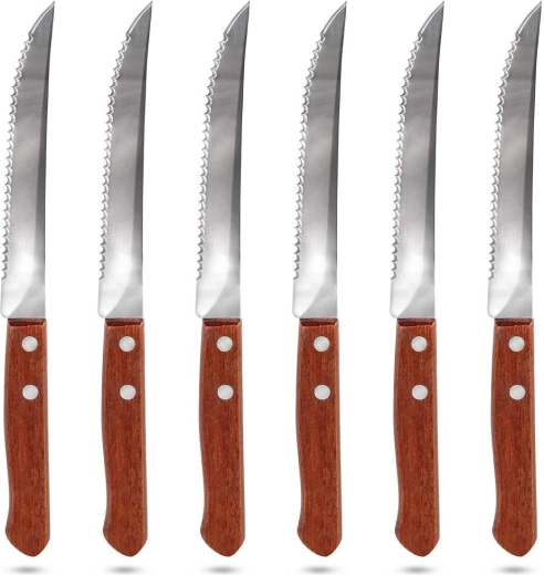 Praktikus 6 darabos steak késkészlet 20,5 cm hosszúsággal, recés rozsdamentes acél éllel a hús, burgerek és pizza könnyű szeleteléséhez. A szegecselt fa nyél biztosítja az erős fogást és a kényelmes használatot. Az éles, recés penge a keményebb hússal is megbirkózik, és sokoldalúan használható otthoni asztalnál, grillezéshez vagy a vendéglátásban.