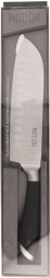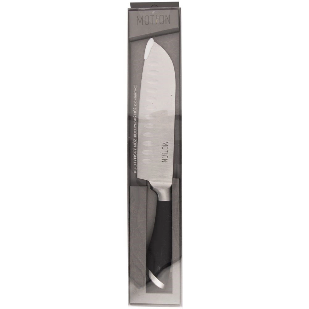 A MOTION santoku kés éles rozsdamentes acél pengét kombinál kényelmes, csúszásmentes, elegáns fekete markolattal. Kiegyensúlyozott kialakításának és pengeformájának köszönhetően kiváló a precíz vágáshoz, aprításhoz és szeleteléshez. A minőségi rozsdamentes acél penge sokáig megtartja élességét, és könnyen hatol át az alapanyagokon.