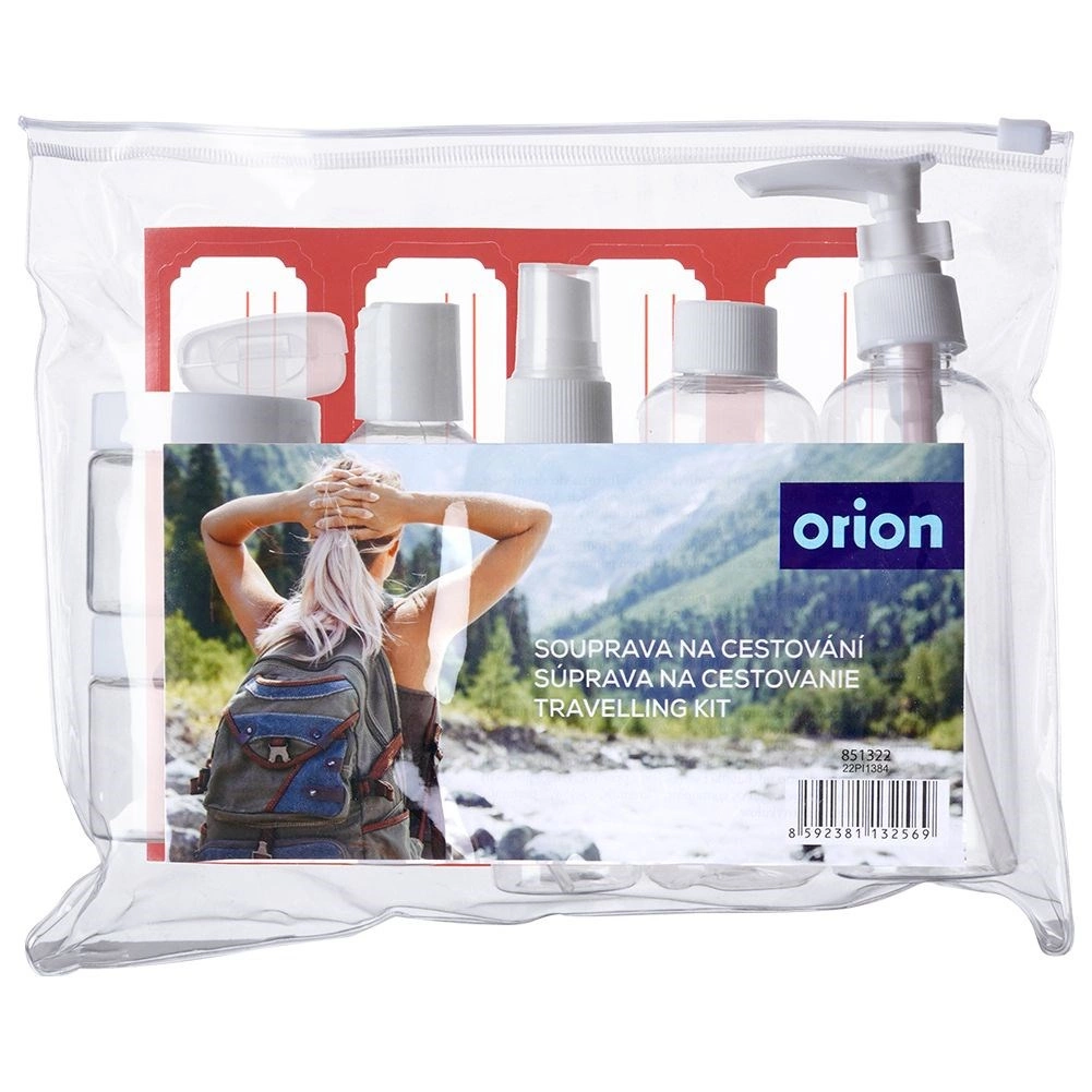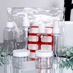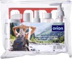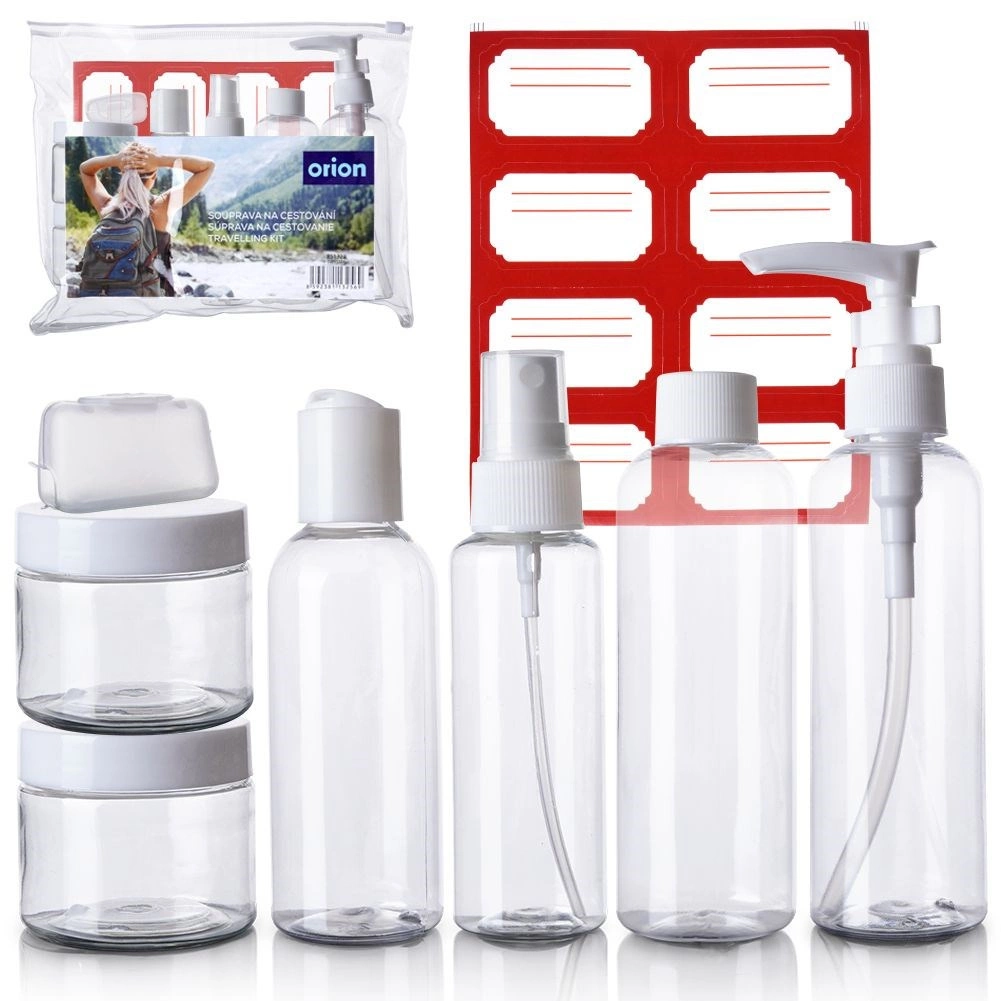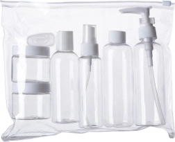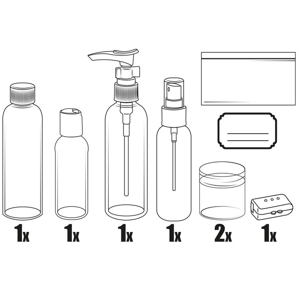 - 1× csavaros zárású palack 100 ml (3,5 × 12 cm), 1× csavaros zárású palack 90 ml (3,5 × 11 cm), 1× pumpás palack 100 ml (3,5 × 15 cm), 1× permetezős palack 70 ml (3 × 13 cm), 2× csavaros kupakos tégely 70 ml (5 × 4,8 cm), 1× fogkefevédő, 6× címke, 1× cipzáras tok (22 × 17 cm)