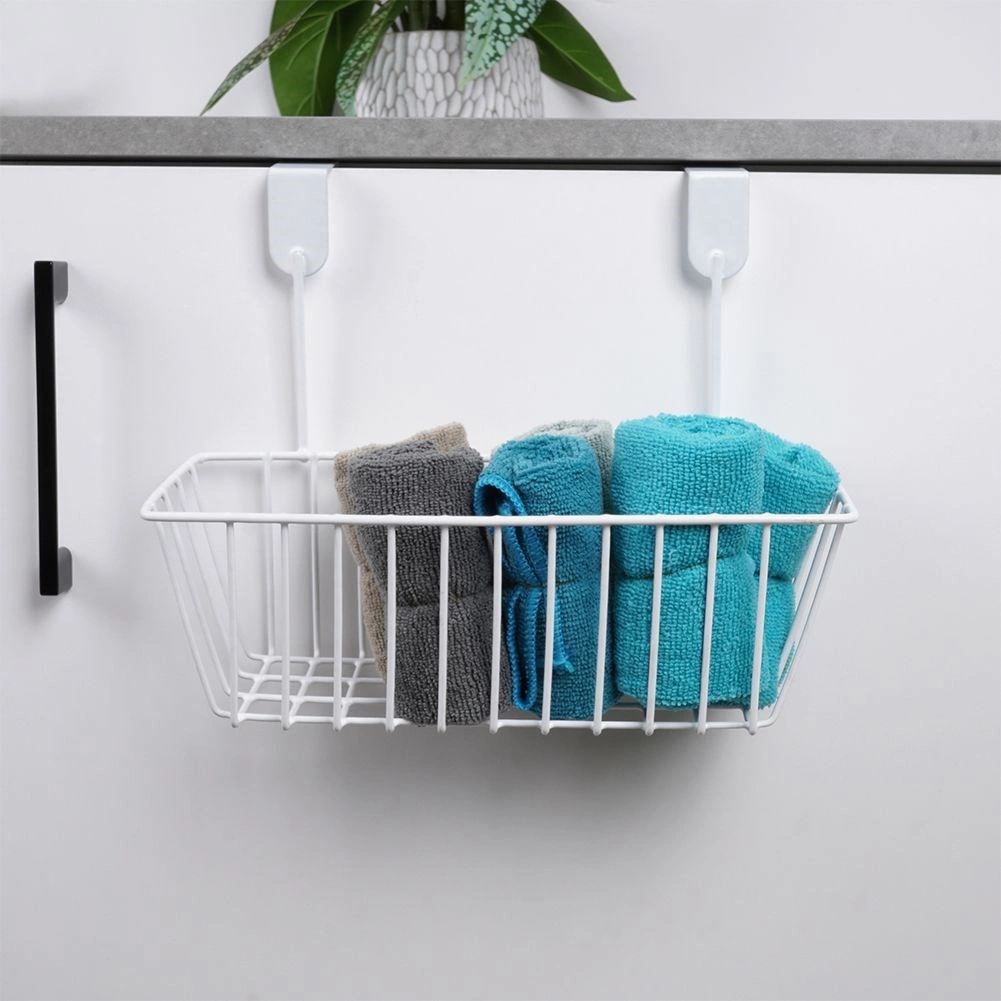 Maximalizálja a szekrényekben a helyet ezzel a strapabíró akasztós kosárral. Egyszerűen az ajtóra helyezhető, szerszám és fúrás nélkül. A drótszerkezet jó rálátást és szellőzést biztosít – ideális törölközőkhöz, tisztítószerekhez vagy élelmiszer-kiegészítőkhöz.