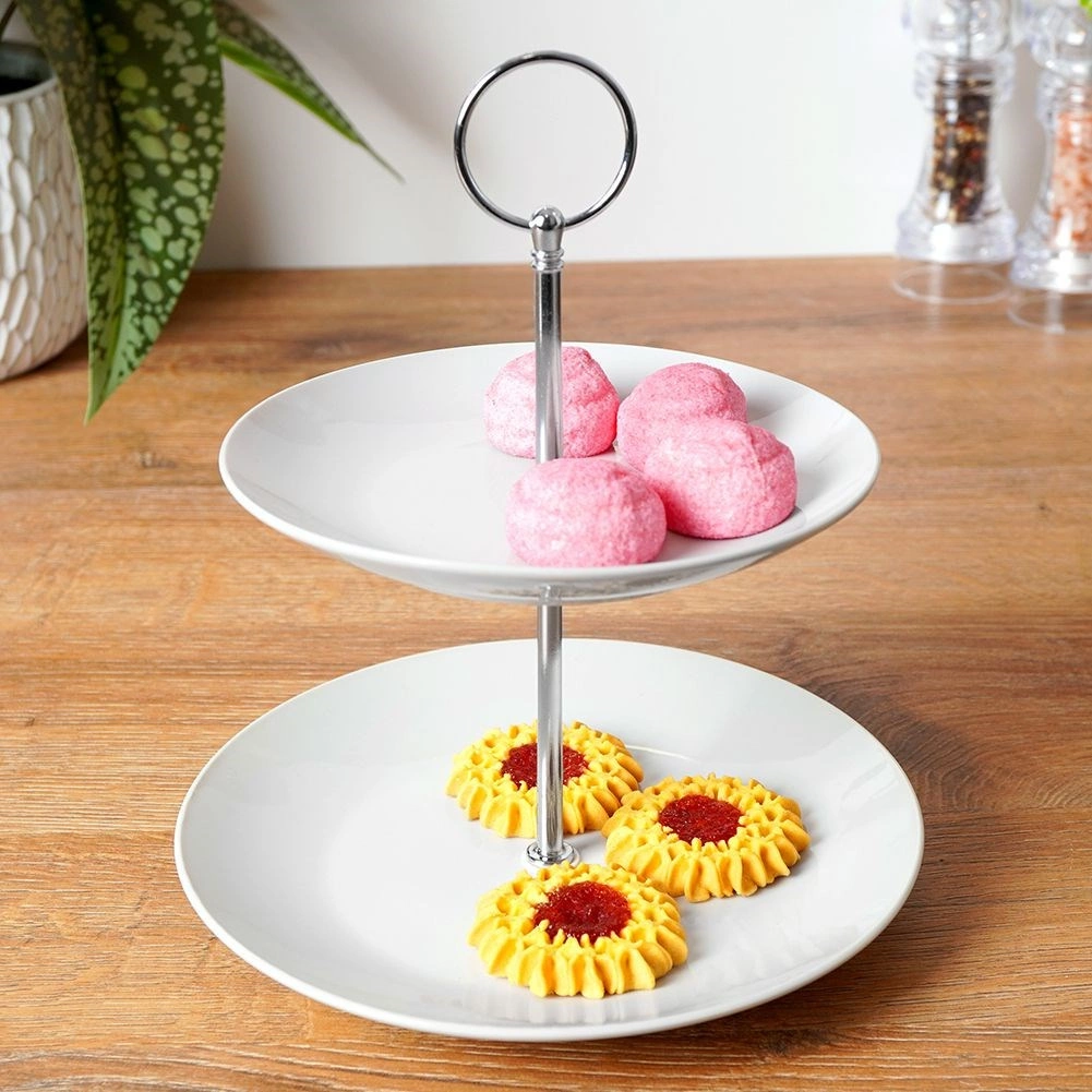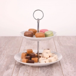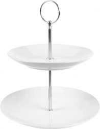 Ez a kétszintes porcelán állvány időtlen fehér színben remek kiegészítője minden terítésnek. Készítsen stílusos sweet bart, vagy tálaljon elegánsan gyümölcsöt, makaronokat, süteményeket vagy sós falatokat. A stabil szerkezet középső fém rúddal és praktikus fogantyúval a biztonságos mozgatást akkor is lehetővé teszi, ha az állvány meg van pakolva.