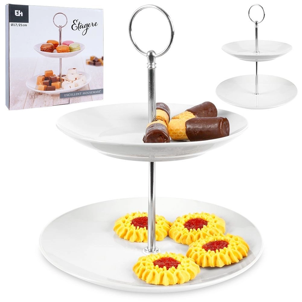 A felső, 17 cm-es és az alsó, 21 cm-es tányér bőséges helyet kínál desszerteknek és sós falatoknak, miközben helytakarékos az asztalon.