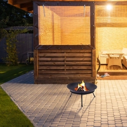 Stílusos, 57 cm átmérőjű kerti tűzrakó stabil állványon, amely meleget, hangulatot és biztonságos égést nyújt teraszon és kertben egyaránt. Az ellenálló fekete színű öntöttvas tál kiválóan tárolja a hőt, és hosszú évekre készült. A döntött tálformának köszönhetően a szél nem fújja ki a fahasábokat, a láng pedig könnyebben kordában tartható.