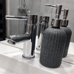 Stílusos adagoló folyékony szappanhoz vagy mosogatószerhez, amely a sötétszürke árnyalatú, márványozott textúrájú minőségi üveggel tűnik ki. A fémes fényű pumpa prémium megjelenést kölcsönöz és kényelmes, pontos adagolást biztosít. Illik modern, klasszikus, loft és indusztriális enteriőrökhöz.