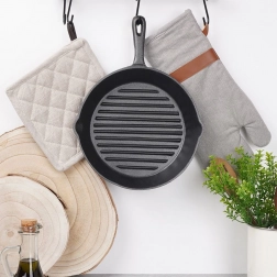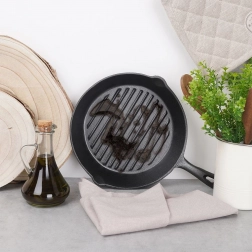 Ez a 24 cm-es öntöttvas grillserpenyő ideális intenzív pirításhoz, sütéshez és grillezéshez. A nehéz öntöttvas egyenletesen melegszik fel és sokáig tartja a hőt, így az ételek tovább maradnak melegek és szaftosak. A belső bordázott felület elvezeti a felesleges zsiradékot és látványos grillmintát készít.