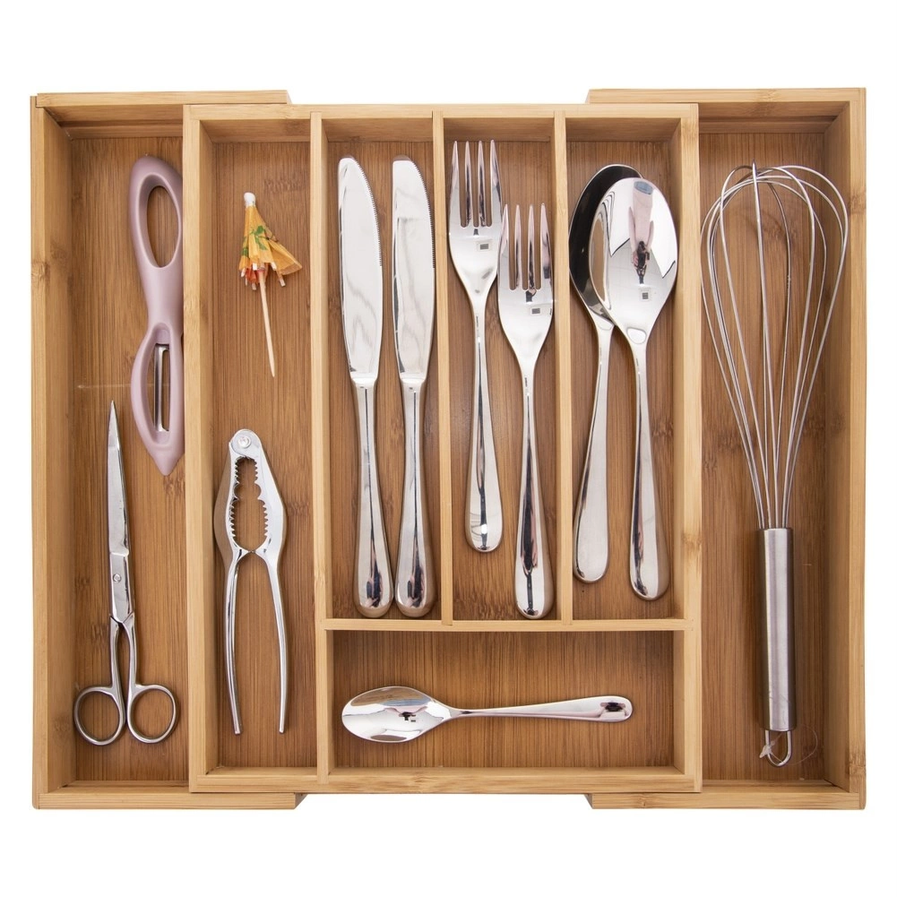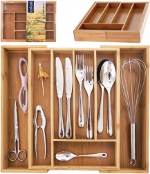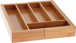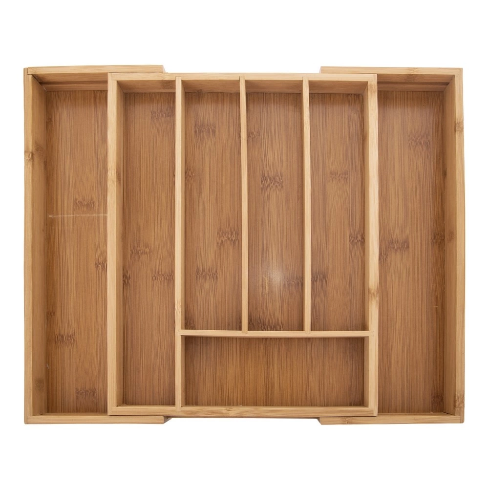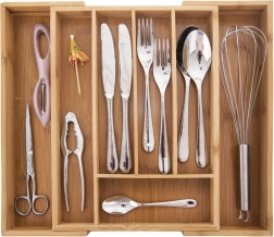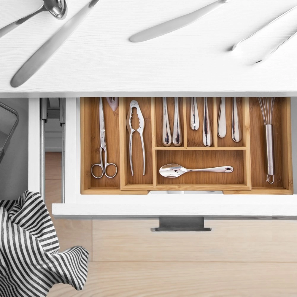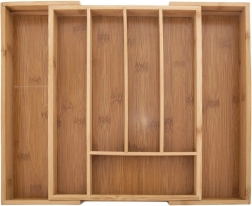 A bambuszfa ellenáll a nedvességnek és a deformációnak, nem veszi át a szagokat, és könnyen tisztítható. A rendező 5-től 7 rekeszig kínál lehetőséget a választott bővítéstől függően, így a belső elrendezést igényeihez igazíthatja – a villáktól és kanalaktól a hámozókon, habverőkön át a konyhai ollóig.
