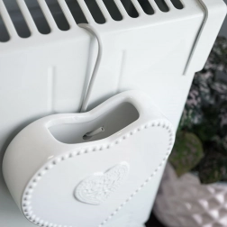 Elegáns, szív alakú kerámia légnedvesítő radiátorra akasztva. A 200 ml-es űrtartalomnak köszönhetően fűtési szezonban segít fenntartani az optimális páratartalmat, fényes kivitelű, könnyen használható, és dekoratív kiegészítőként is szolgál bármely enteriőrben.