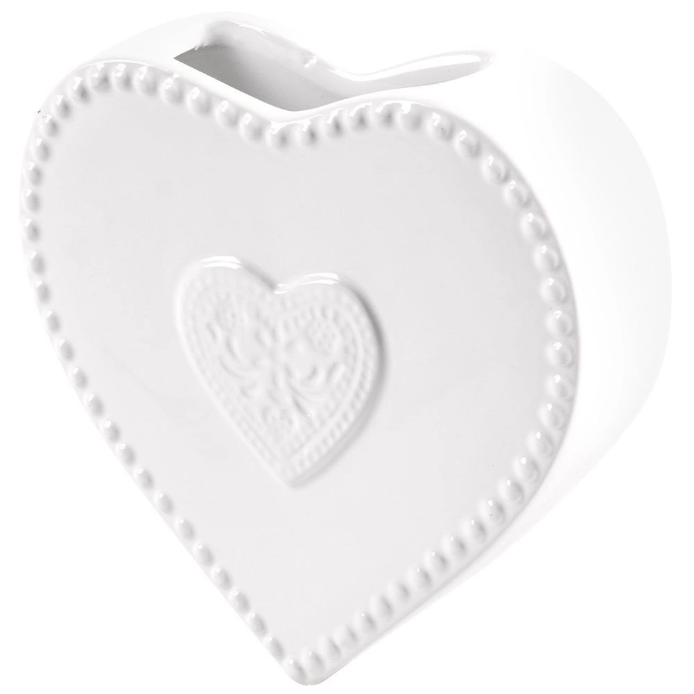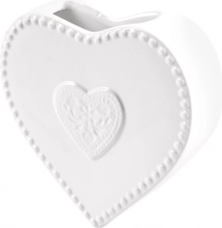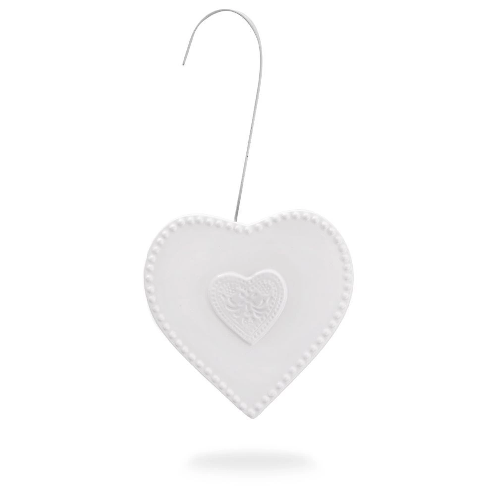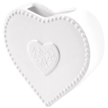 A fehér máz, a gyöngyházfényű perem és a plasztikus szívmotívum elegáns megjelenést kölcsönöz a fűtőtestnek és a helyiségnek.
