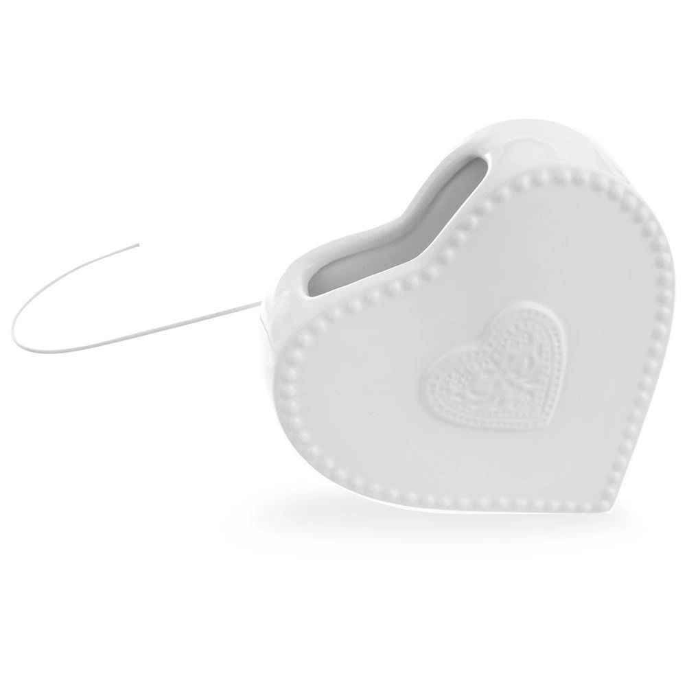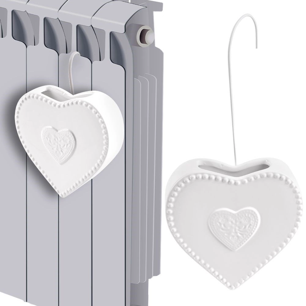 Ez a fehér, szív dombormintás kerámia radiátorpárásító praktikus megoldás a száraz levegő ellen a fűtési időszakban. Elég vízzel megtölteni, majd felakasztani a radiátorra a fém akasztóval – a víz lassan elpárolog, és javítja a helyiség klímakomfortját.