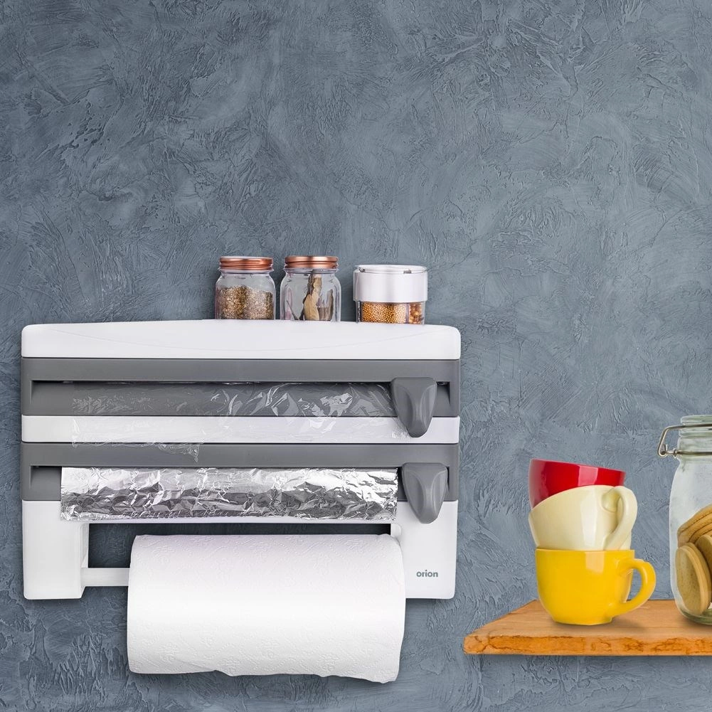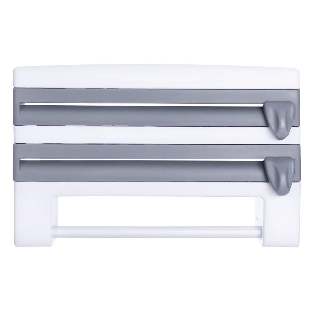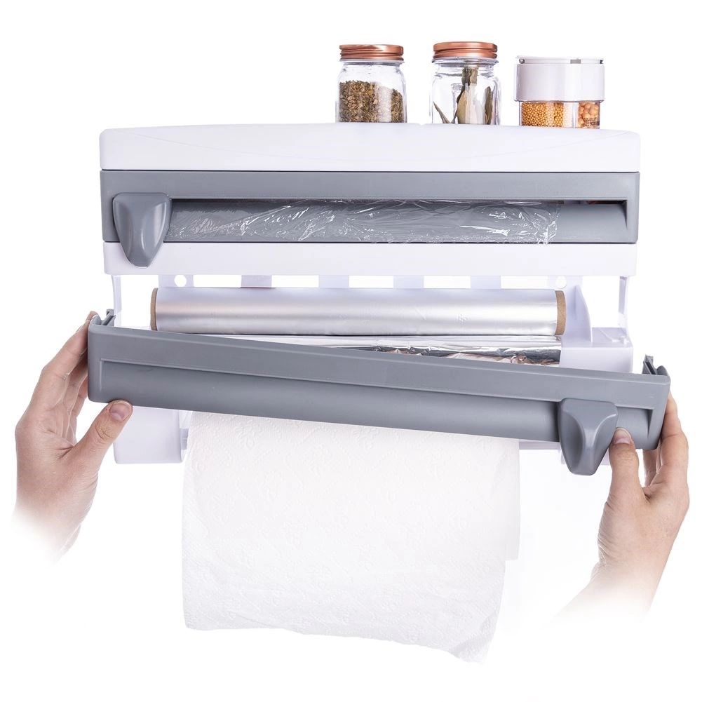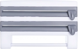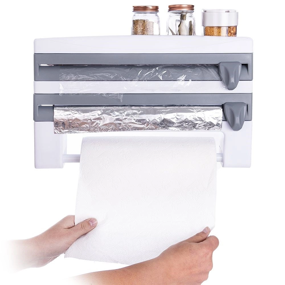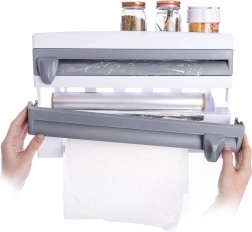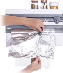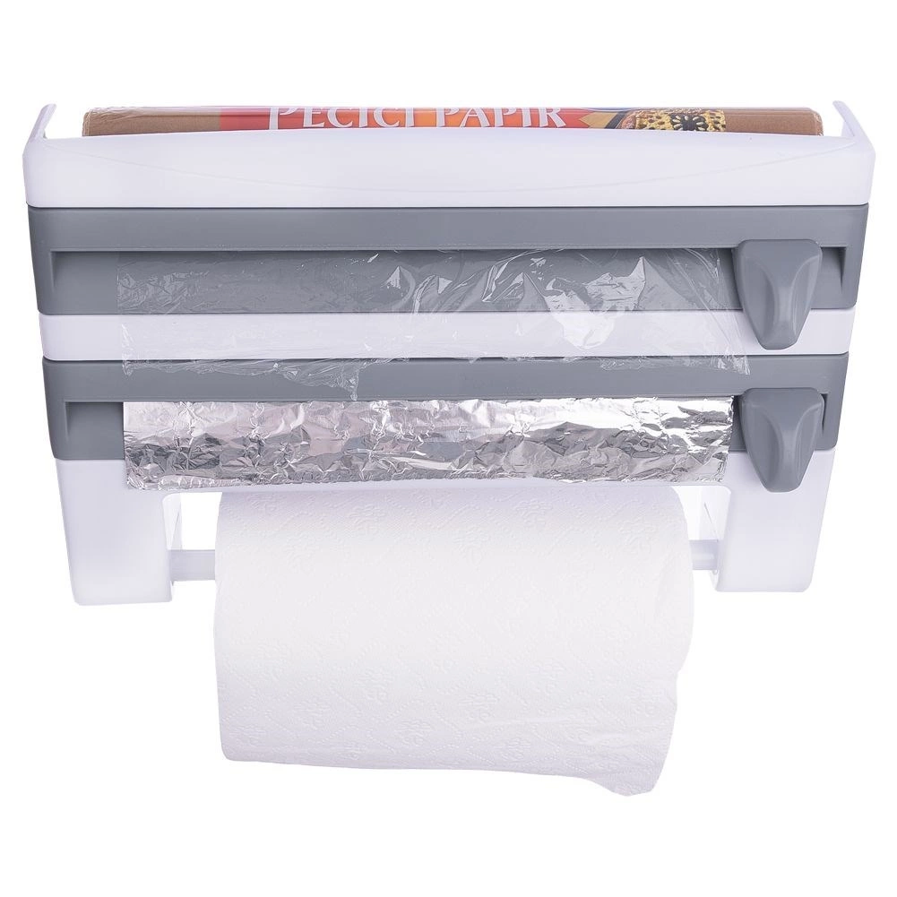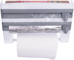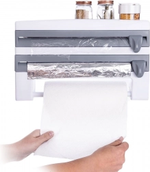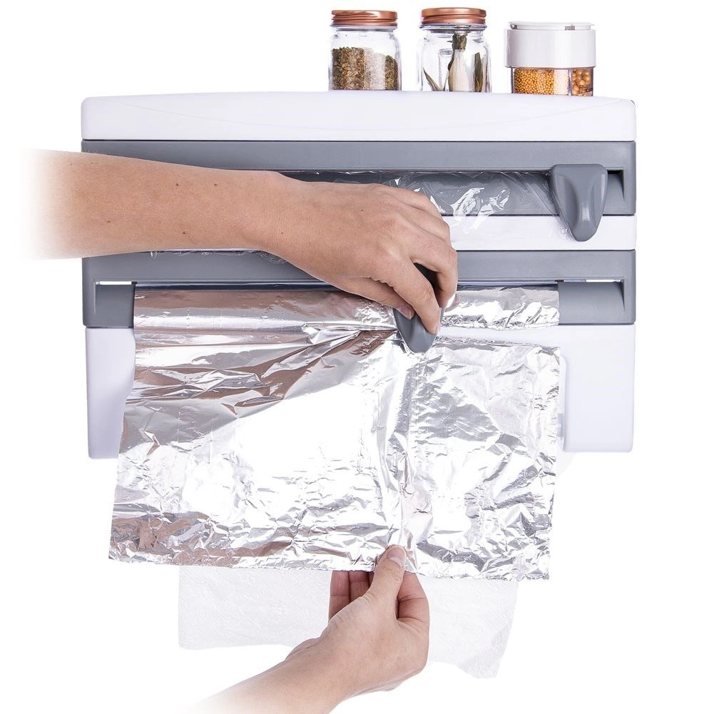 A 3 az 1-ben fali fólia- és papírtörlő‑adagoló okos megoldás minden konyhába és vendéglátóipari környezetbe. Két különálló tartály integrált késekkel biztosítja a folyamatos letekerést és a biztonságos, pontos vágást az élelmiszer- és alumíniumfólián. Az alsó rúd a standard papírtörlő‑tekercset mindig kéznél tartja, míg a felső polc helyet ad a fűszereknek, sütőpapírnak vagy apró konyhai eszközöknek.