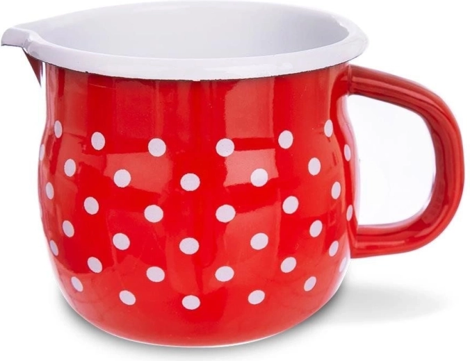 Stílusos, piros, fehér pöttyös zománcozott bögre kiöntőcsőrrel, 800 ml űrtartalommal, ideális a mindennapi használatra. A masszív acélnak és a minőségi zománcbevonatnak köszönhetően egészségre biztonságos, allergiások számára is alkalmas és könnyen tisztítható. Sokoldalúan használható italok melegítéséhez és tálalásához, kompatibilis gáz-, elektromos, üvegkerámia, halogén és indukciós főzőlapokkal.