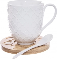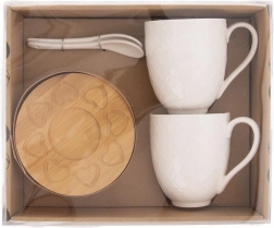 Elegáns, 2 darab 370 ml-es porcelán bögre bambusz alátétekkel és porcelán kanalakkal, díszdobozban. A bögréknek dombornyomott dekorjuk van, kényelmes füllel rendelkeznek, és alkalmasak mosogatógépbe és mikrohullámú sütőbe is (alátét nélkül). A bambusz alátétek megvédik az asztalt a hőtől és a karcolásoktól.