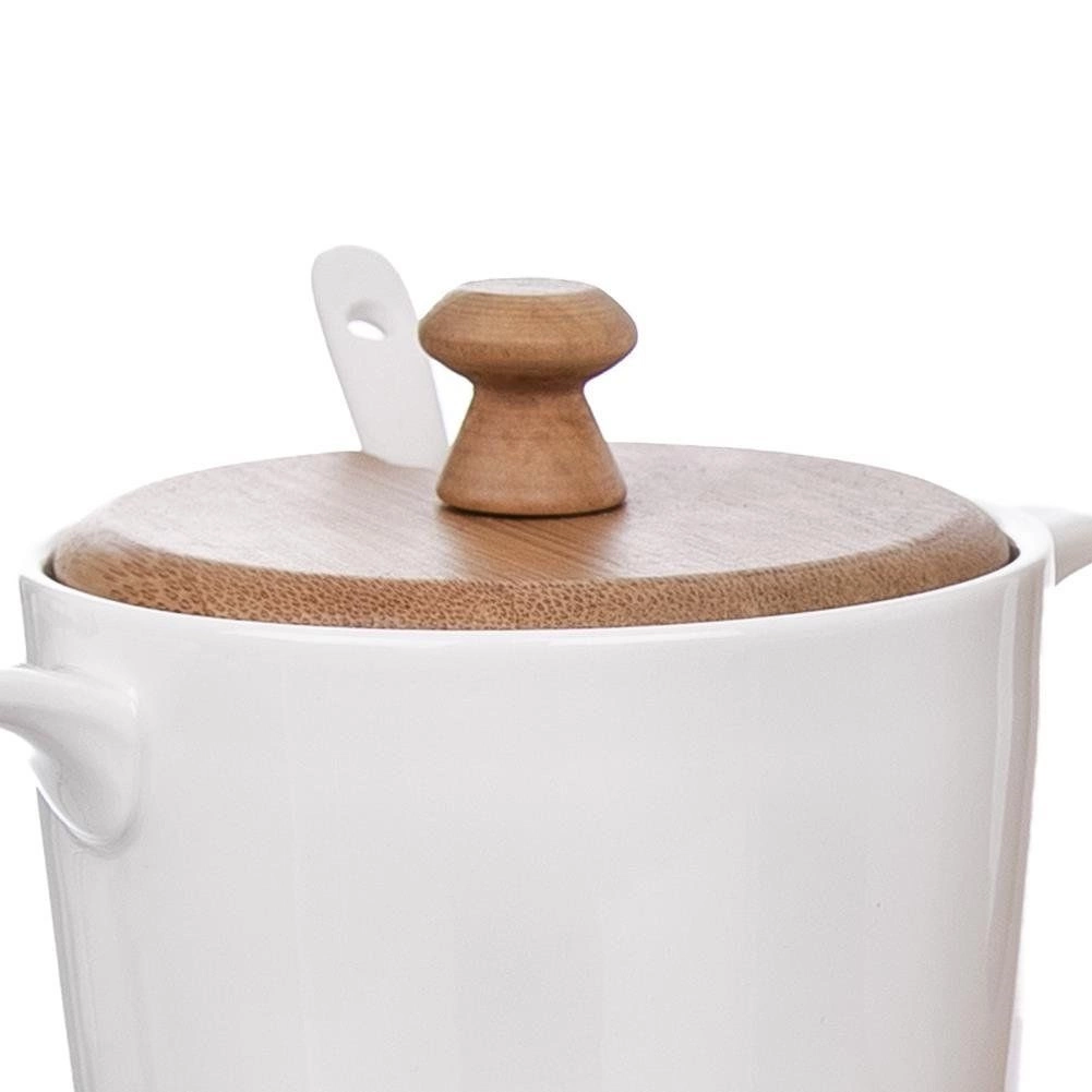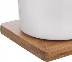 Az ergonomikus füllel és precíz csőrrel ellátott tejeskiöntő kényelmes öntést biztosít, az oldalsó fogókkal, fa fedővel és porcelán kanállal kiegészített cukortartó pedig a tiszta és elegáns cukorszervízt szolgálja. Minden elem áttekinthetően helyezkedik el a stabil bambusz tálcán fogantyúval a könnyű hordozásért.