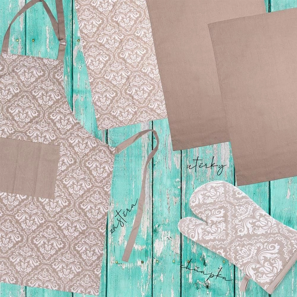 Stílusos pamut konyhai kötény bézs színben, elegáns mintával, amely megvédi a ruházatot főzés, sütés és grillezés közben. Az állítható megkötőknek és az univerzális szabásnak köszönhetően nőknek és férfiaknak egyaránt jól áll. A praktikus első zsebben elférnek apró eszközök vagy receptek, a kötény pedig könnyen mosható 40 °C-on.