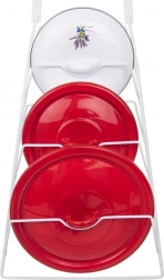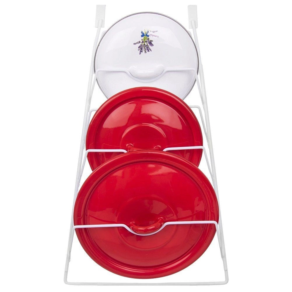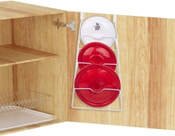 Ez a konyhai rendszerező, függeszthető akasztó formájában, akár 6 különböző méretű fedőt is elbír. Szerelés fúrás nélkül – elég az ajtóra akasztani. Átgondolt kialakításának köszönhetően a fedők áttekinthetően tárolhatók, könnyen hozzáférhetők és védettek a sérülésektől.