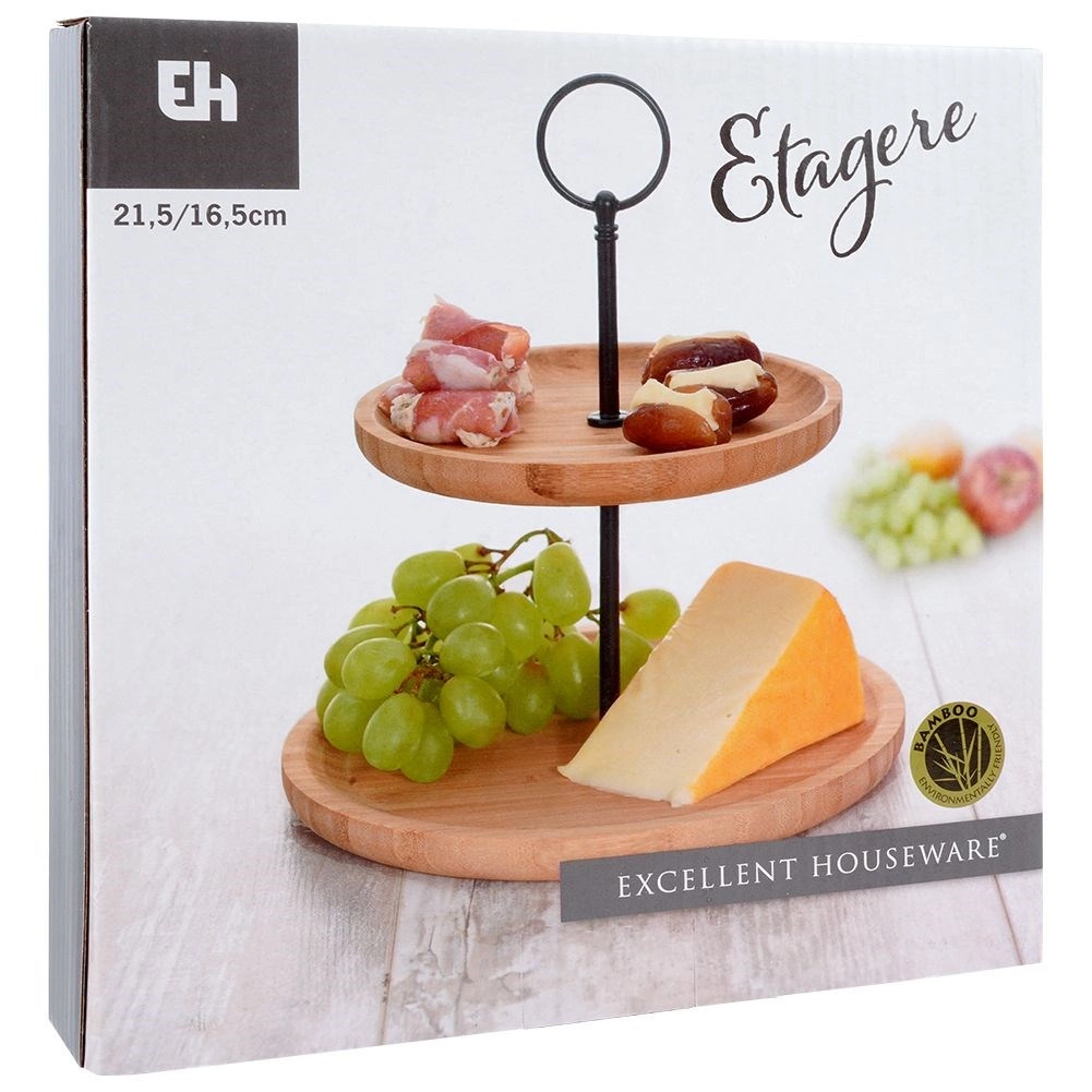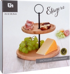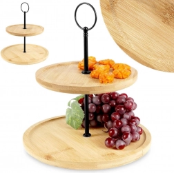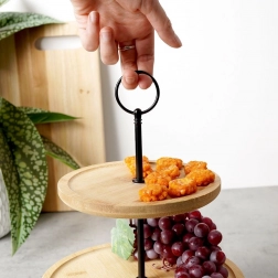 Elegáns, kétszintes bambusz állvány 24 cm magasságban stílusos tálaláshoz és desszertek, gyümölcsök, illetve snackek látványos prezentálásához. A természetes bambusz és a fekete fém elemek modern megjelenést és magas tartósságot biztosítanak. Két különböző méretű tál segítségével könnyedén készíthet látványos elrendezést, helyet takaríthat meg az asztalon, és mindent kényelmesen áthelyezhet a praktikus hordfül segítségével. Egyszerű tisztítás – elég nedves ruhával áttörölni (nem mosogatógépben mosható).