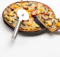 Ez a minőségi rozsdamentes acél pizzavágó ideális vékony és vastag tészta, kerek és téglalap alakú lepények vágásához. Az éles, forgó tárcsa tisztán, szakadások nélkül vág, míg az ergonomikus markolat és az ujjvédő növeli a biztonságot és a kényelmet munka közben.