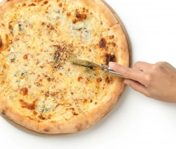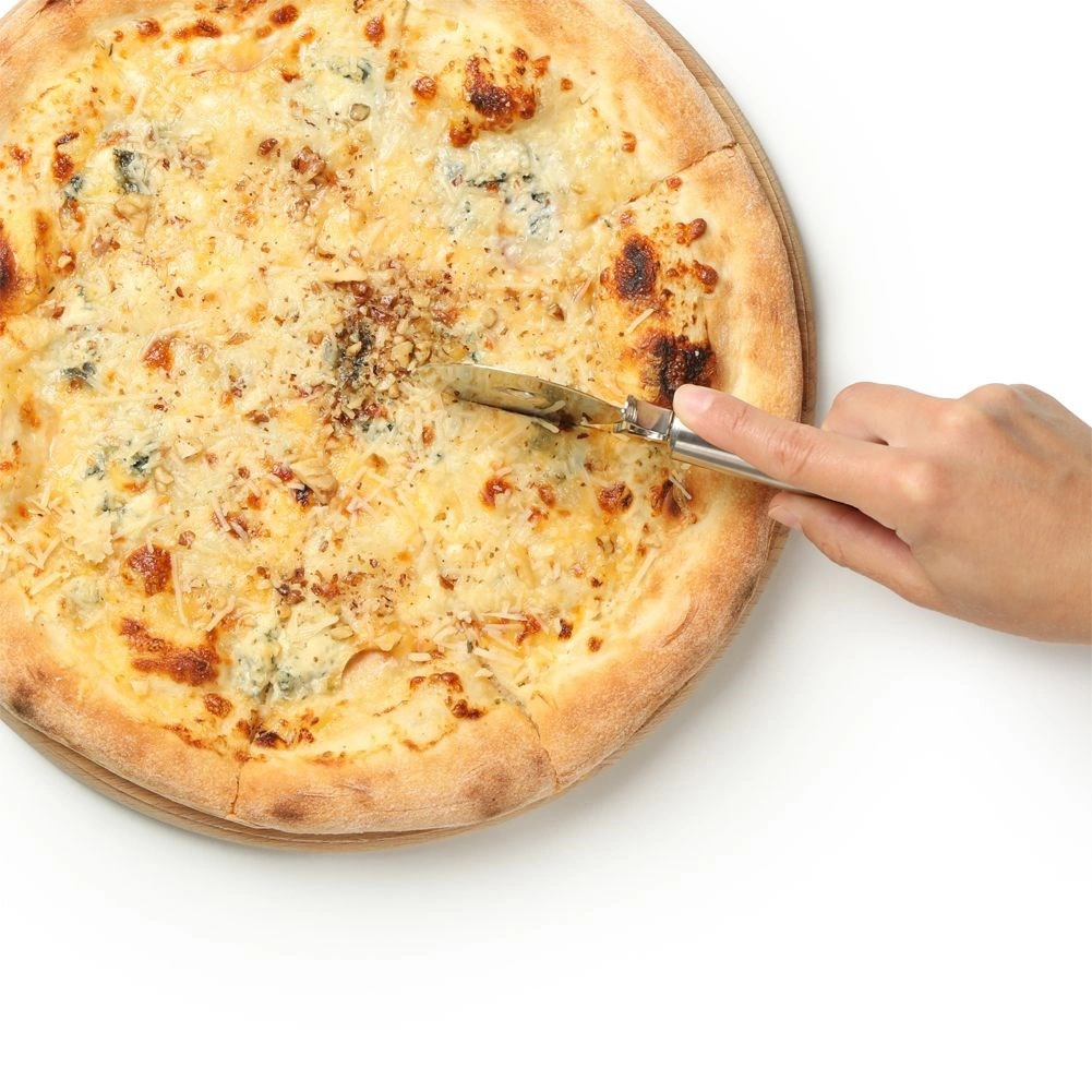 A 7 cm átmérőjű tárcsa simán átvágja a kérget és a sajtot, a pizzát szakadás nélkül egyenlő szeletekre osztja.
