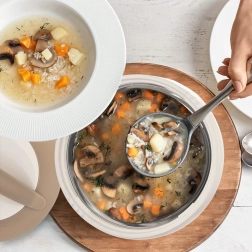 A sima rozsdamentes acél betét tartós, higiénikus és könnyen tisztítható, így az edényt gyorsan újra használatra készítheti.