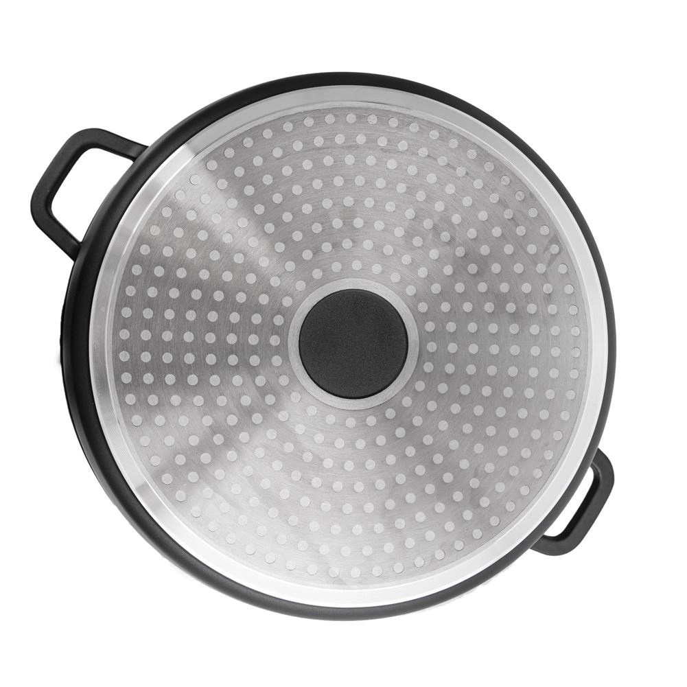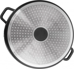 Masszív, 9,7 l űrtartalmú és 32 cm átmérőjű gránit lábas tapadásmentes PFLUON bevonattal és gőzszelepes üvegfedővel. Alkalmas minden típusú tűzhelyhez, beleértve az indukciót, továbbá sütőbe és mosogatógépbe is tehető. Ideális levesekhez, pároláshoz és egyfazekas ételekhez.