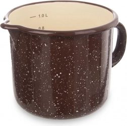 Stílusos barna, bézses pöttyözésű, retro dizájnú zománcozott bögre, amely megkönnyíti a mindennapi főzést és sütést. A praktikus kiöntőnek köszönhetően kényelmes a folyadékok öntése, a belső mérce pedig lehetővé teszi a folyadékok és szilárd alapanyagok pontos kimérését további eszközök nélkül. A masszív fül biztonságos és kényelmes fogást biztosít.