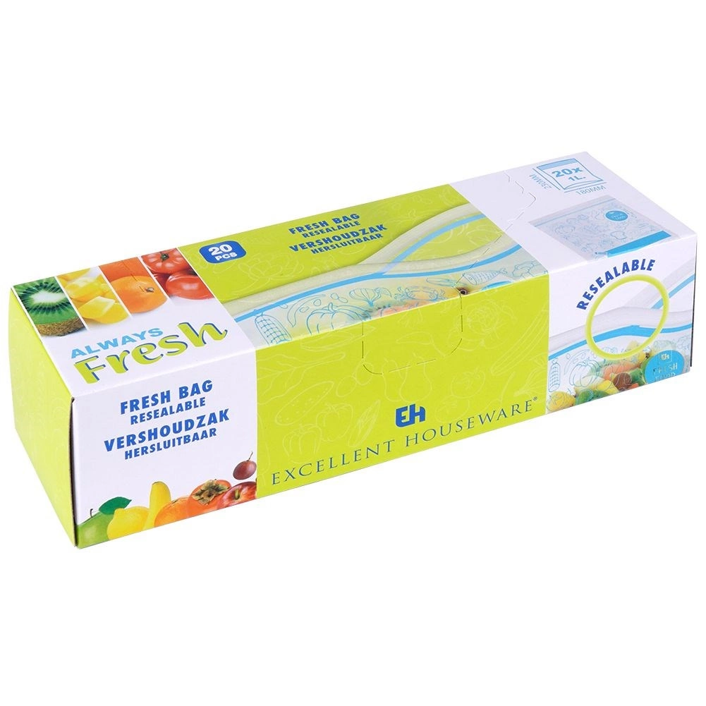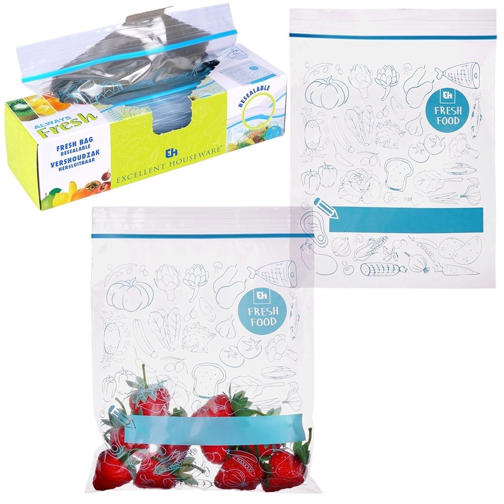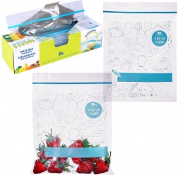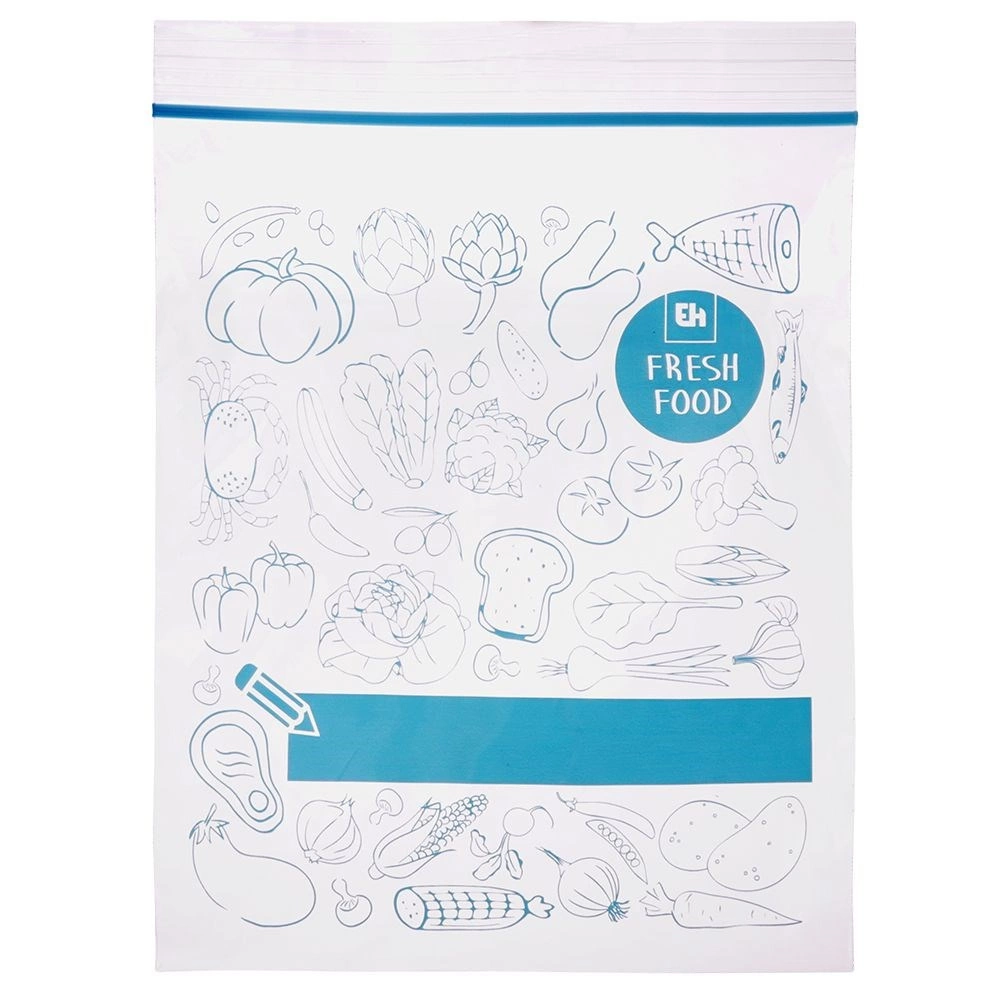 Az univerzális cipzáras élelmiszeres tasakok remekek gyümölcs, zöldség, hús, pékáru és száraz alapanyagok tárolására. A masszív zárnak köszönhetően a tartalom nem szóródik ki, és nem veszi át az idegen szagokat. Az átlátszó test stílusos kék mintával és feliratozható mezővel megkönnyíti a konyhai rendszerezést.