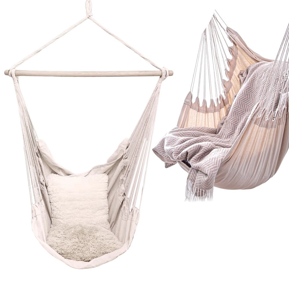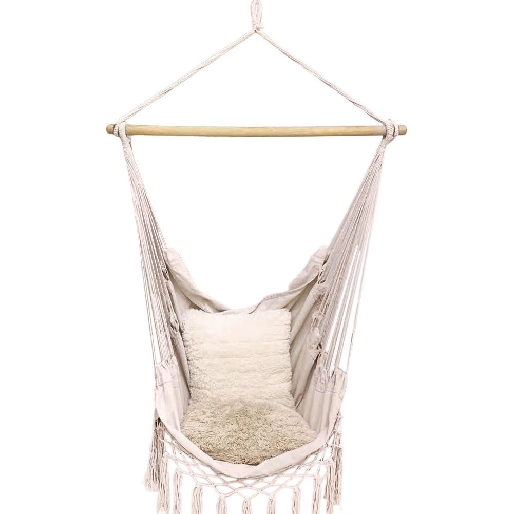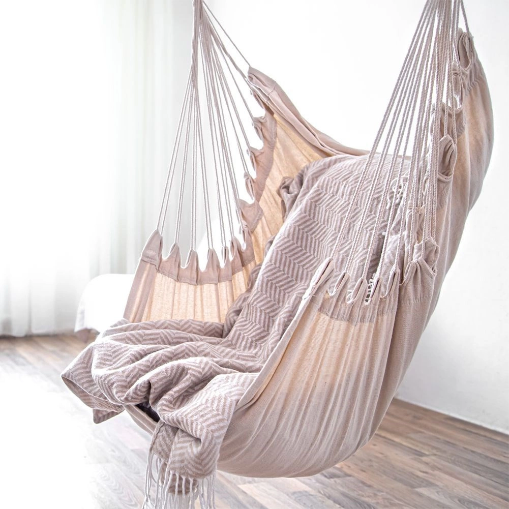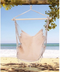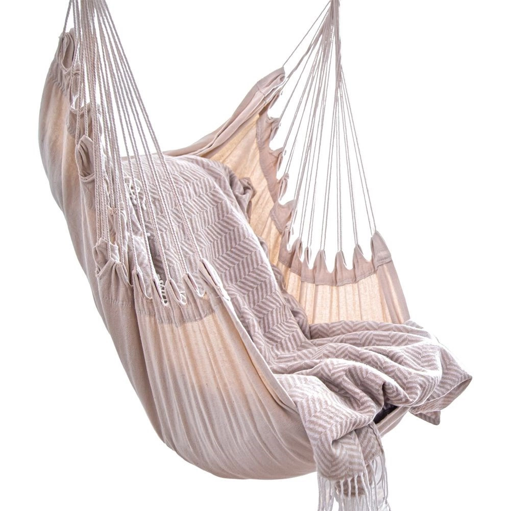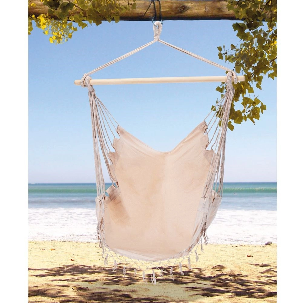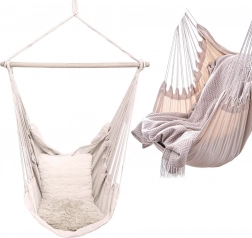 Élvezze a pihenést otthon és a szabadban ezzel a stílusos, bézs színű brazil függőfotellel. A 95 cm hosszú fa terpesztőrúdnak, a 60% pamut és 40% poliészter tartós keverékszövetnek, valamint az egypontos felfüggesztésnek köszönhetően nyújt kényelmes kikapcsolódást, egyszerű telepítést és megbízható, akár 120 kg teherbírást.