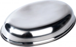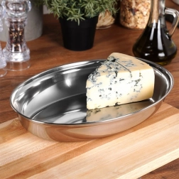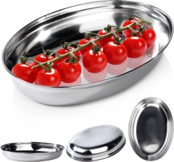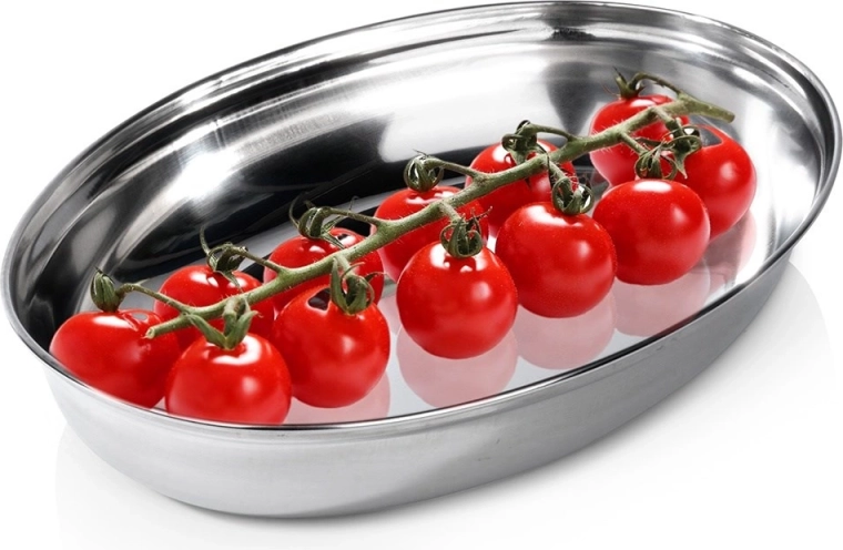 Elegáns ovális tálca minőségi rozsdamentes acélból, 25,5 × 18 × 4 cm méretben, ideális ételek, előételek és frissítők tálalásához. Strapabíró anyagának köszönhetően törhetetlen, higiénikus és könnyen tisztítható, amit a háztartások és a professzionális vendéglátás egyaránt értékel. Sokoldalúan használható a konyhában, kerti partikon és utazás közben is.