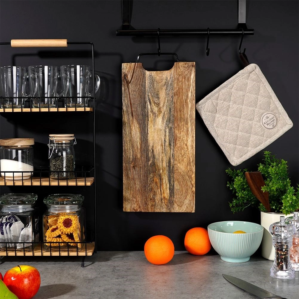 A robusztus fekete fogantyú megkönnyíti a hordozást és a konyhai sínre akasztást – a deszka mindig kéznél van és jól szárad.