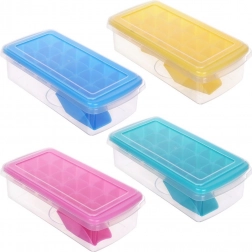 A praktikus fedél megakadályozza a víz kiömlését mozgatás közben, és megóvja a jeget a fagyasztó szagaitól. A készletben lapát is található a tiszta és kényelmes adagoláshoz. A formát használhatod dzsúszok, sorbetek vagy akár fűszernövények fagyasztására is. A szín véletlenszerű.